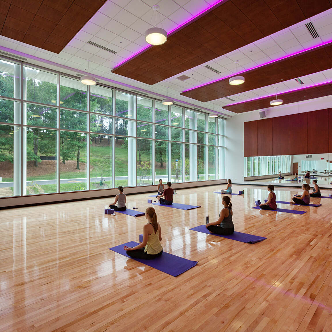 Weight, fitness, and cardio areas are equipped with a variety of modern equipment and bathed in natural light from expansive windows, fostering an energizing atmosphere. Its open and welcoming design inspires students of all fitness levels to feel comfortable and motivated.