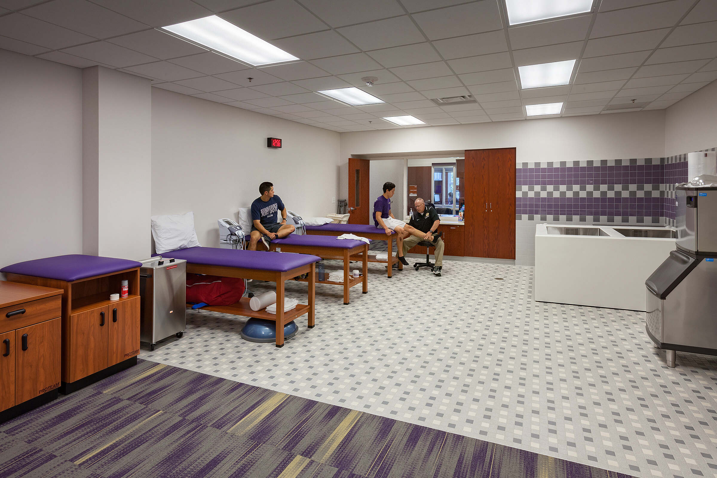 The wellness suite provides a dedicated space for students to recover, stretch, or seek assistance if they are injured. Designed for comfort and relaxation, it offers a calm environment where students can address their physical needs and rejuvenate.