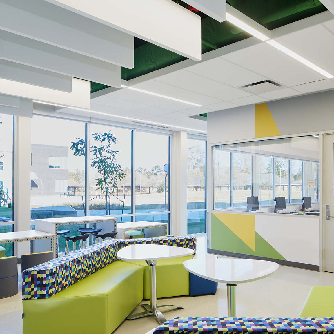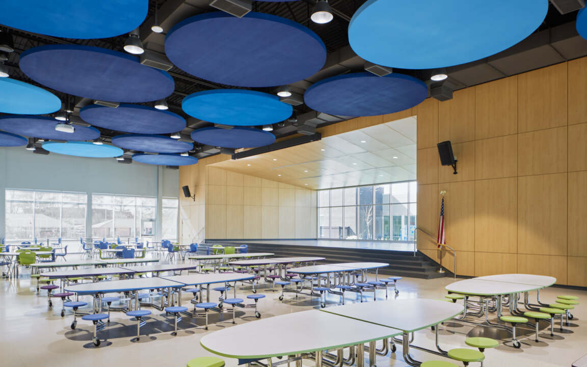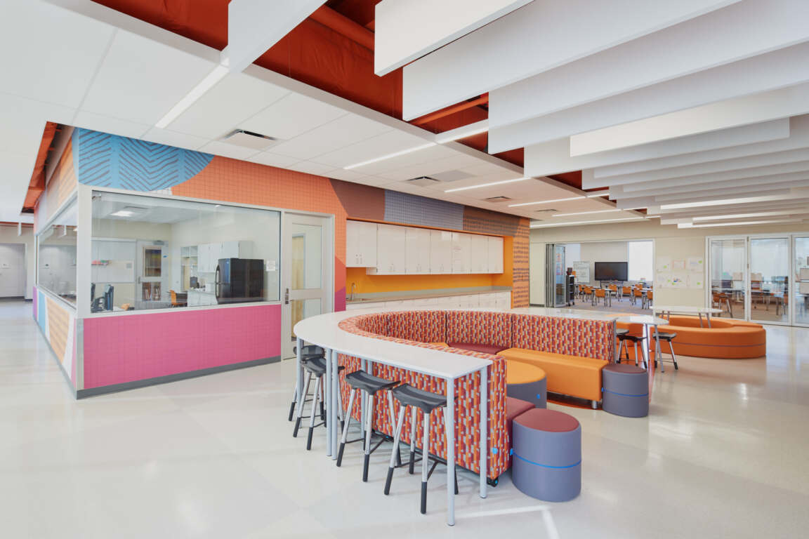 The school’s four learning communities are designed for maximum flexibility. Instead of traditional classrooms, studios with folding glass partitions open to centrally located learning commons for collaborative and large group activities. Learning commons also include two small group rooms, teacher planning areas and built-in storage.
