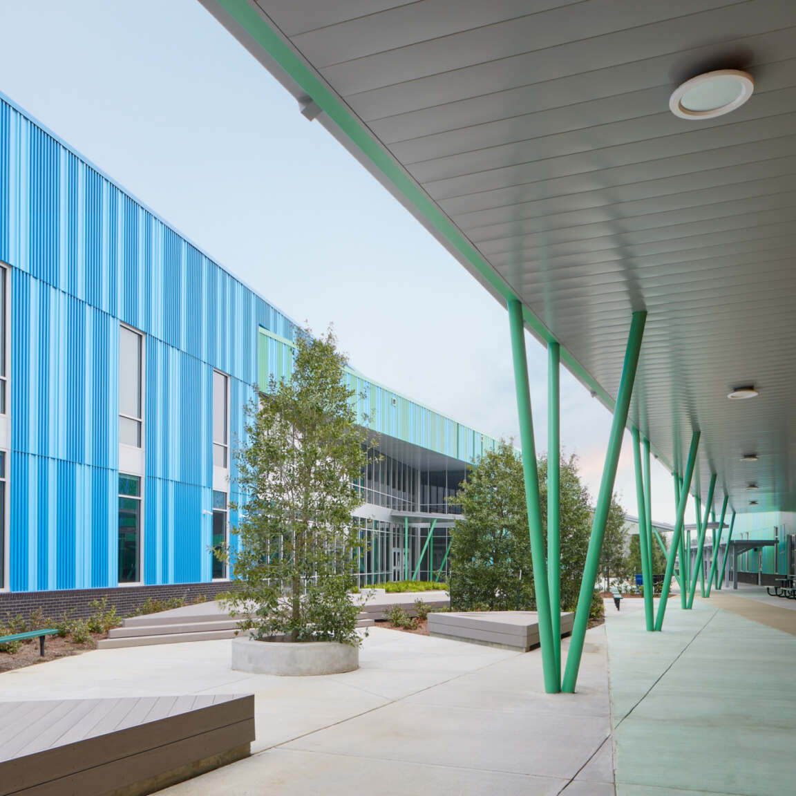 Architecturally, the modern building features clean lines and elegant, high-quality finishes while still reflecting a sense of youthfulness and fun via bright colors and a welcoming covered entryway.