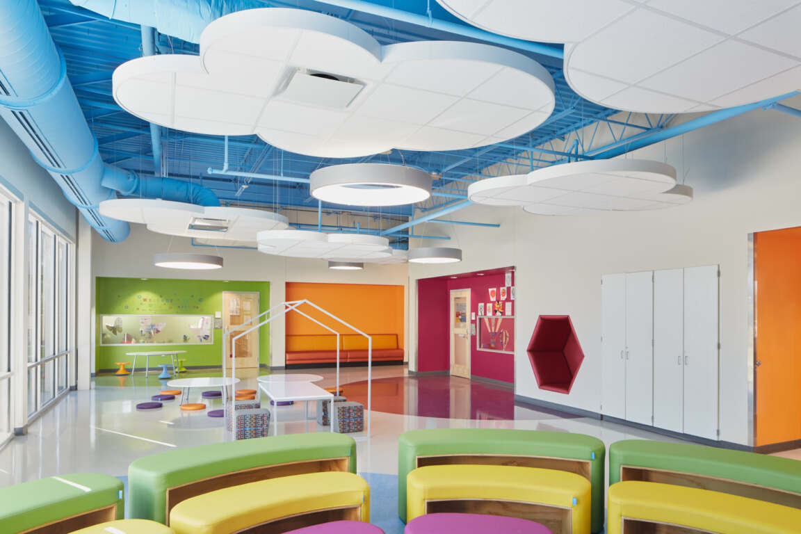 Diagrammatically, the school is divided into two buildings. The south building houses the majority of administrative offices, pre-K and kindergarten classrooms, special education, commons areas, music rooms, and athletic spaces. Meanwhile, the north building contains learning studios, elective areas, and a media hub. The two structures are connected by a secure courtyard that can facilitate learning activities as well as controlled movement between buildings. Outdoor spaces — including the courtyard and play areas — are defined by the buildings’ extents. This design internally focuses many of the school’s functions to have as little impact as possible on the surrounding neighborhood.