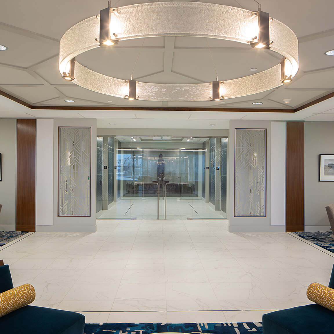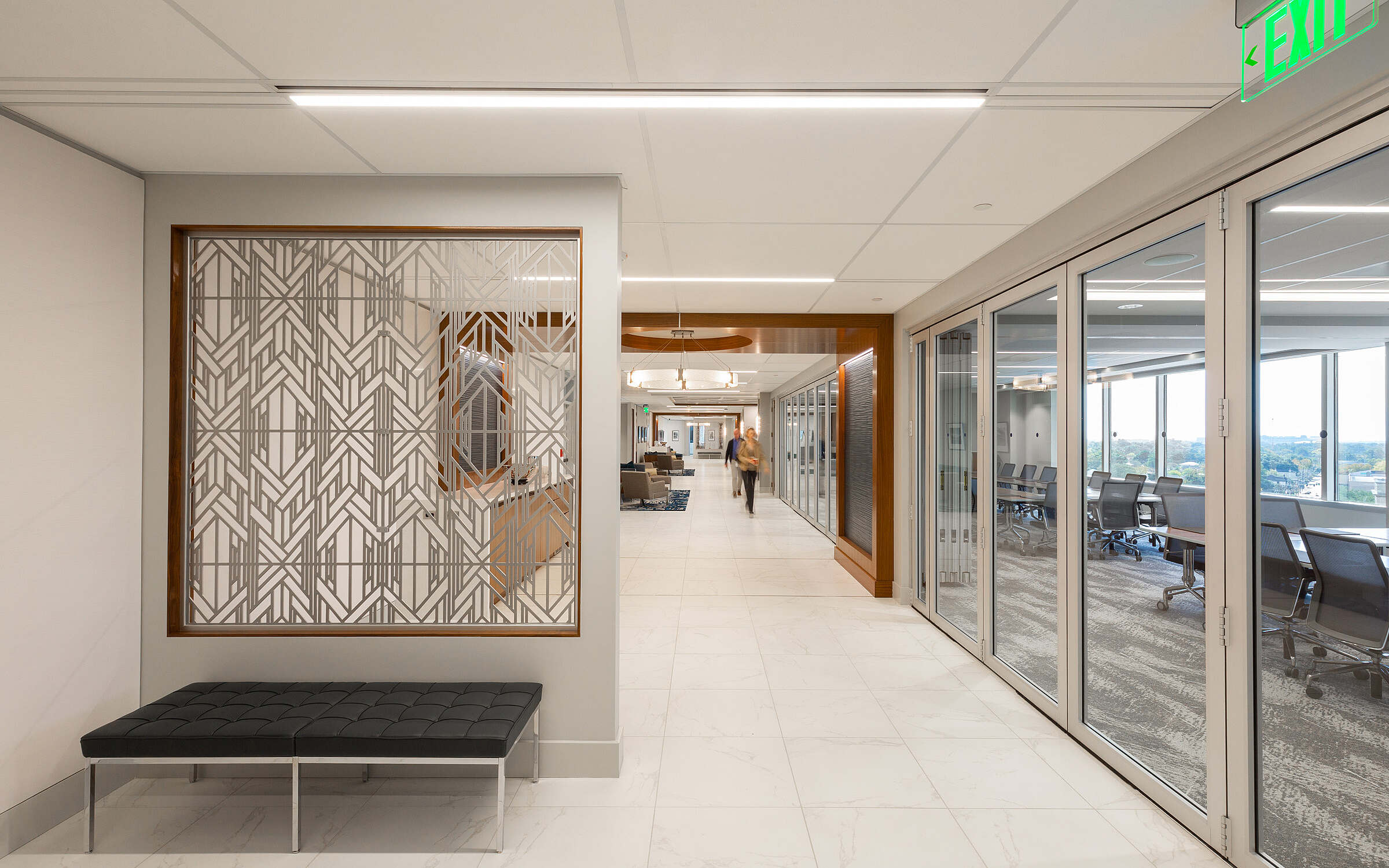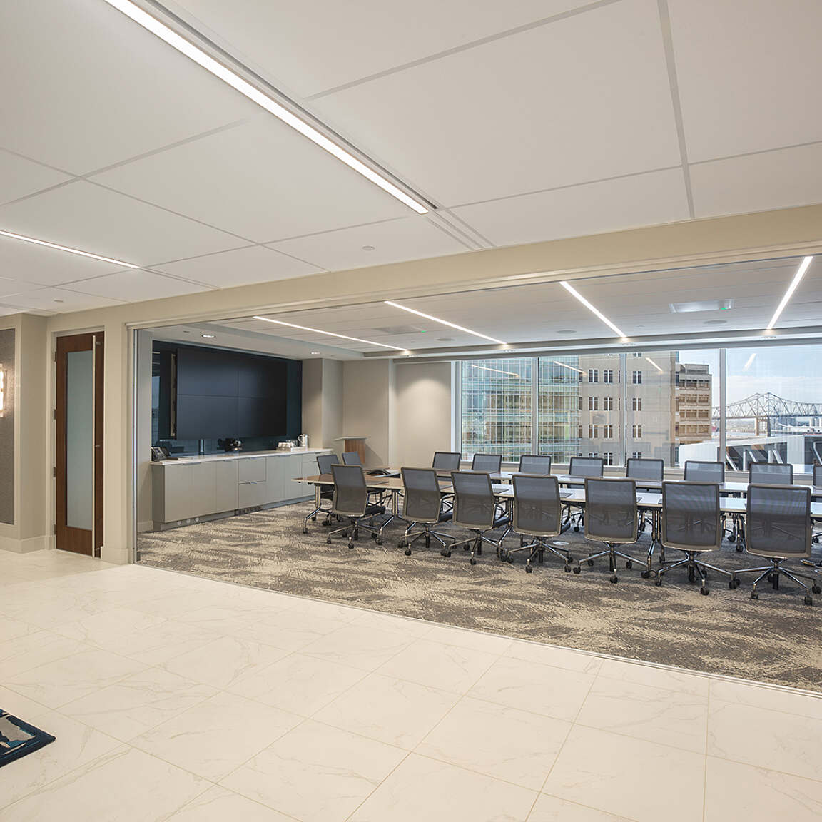 The spacious main lobby and offices feature a warm-gray tone inspired by the metalwork and limestone façade found in the nearby Louisiana State Capitol Building. In a nod to the skyscraper itself, which was designed in 1930, Art Deco-inspired lighting, carpeting, patterns and architectural details give the space a timeless sophistication. Vertical walnut panels provide a textural contrast to the stone-inspired flooring and custom metal screens. Glass-fronted walls capitalize on the lofty location and help to infuse the interior with natural light.