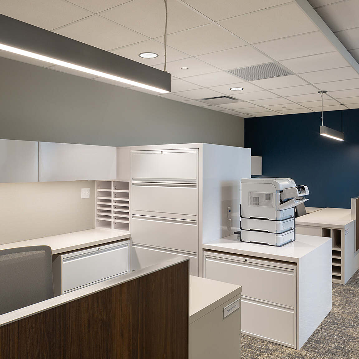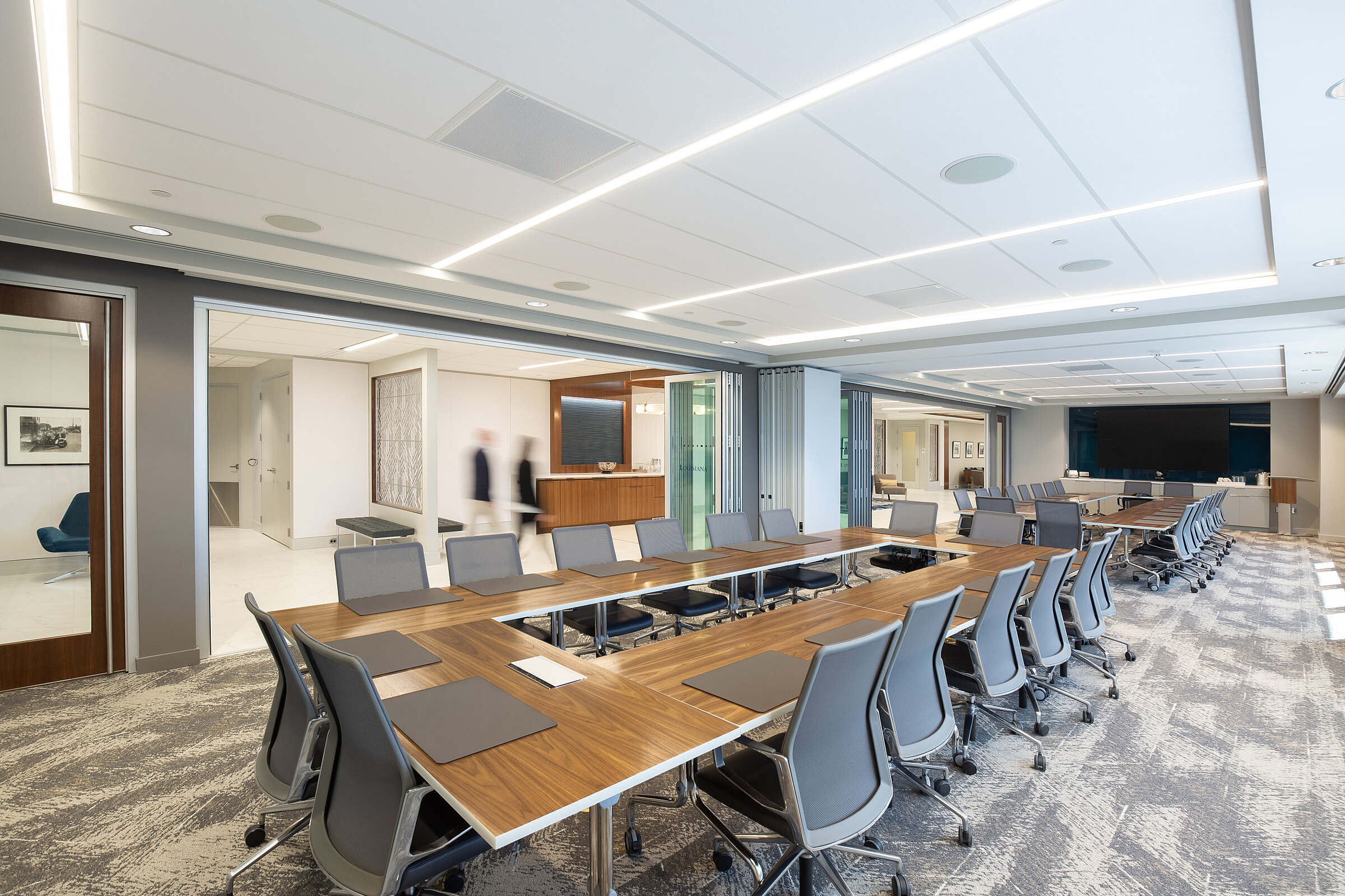 Jones Walker’s conference spaces are equipped with state-of-the-art technology and contemporary linear lighting, while custom millwork credenzas function as refreshment areas and house audiovisual equipment. Adjacent hospitality stations provide convenient amenities for meetings and events.