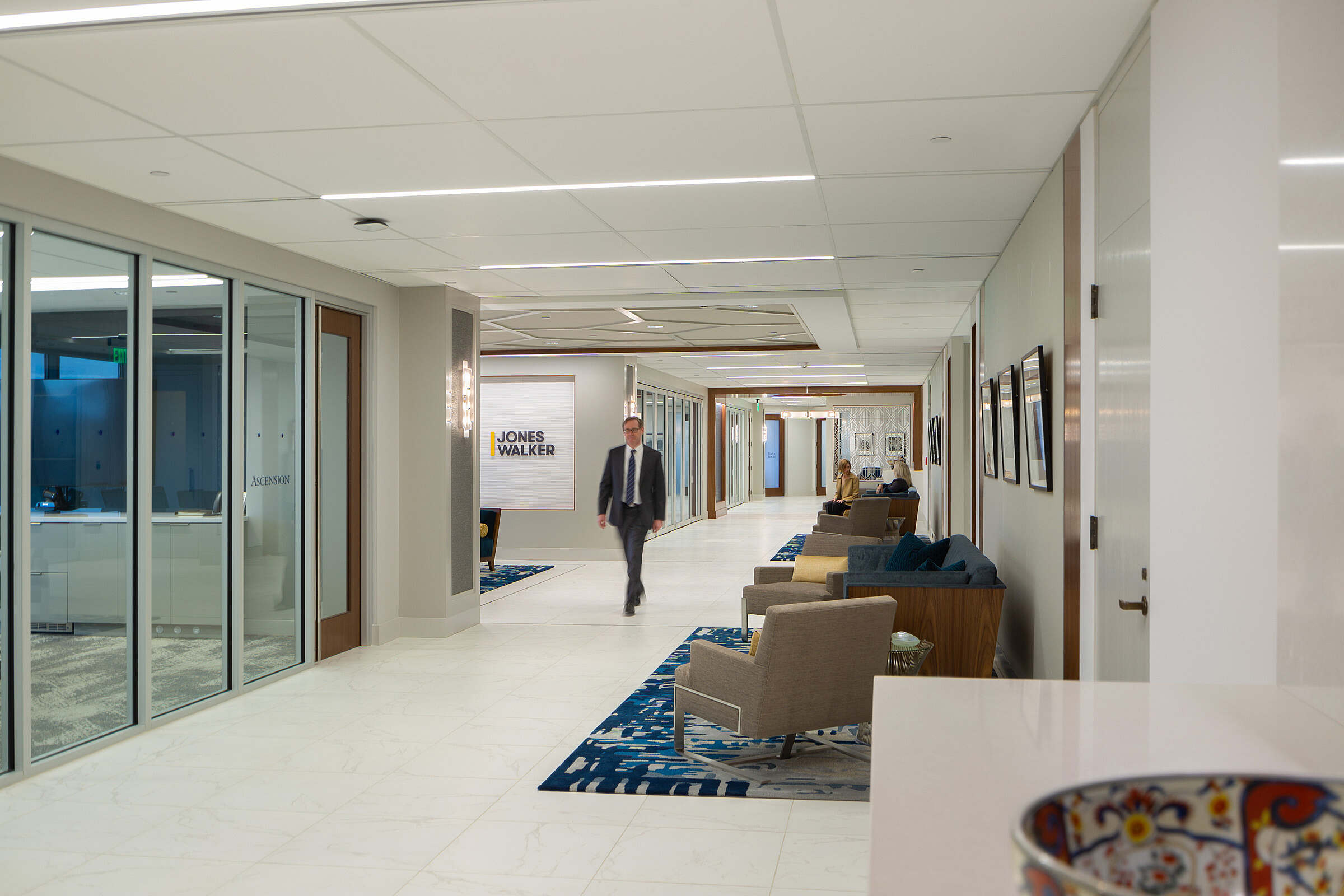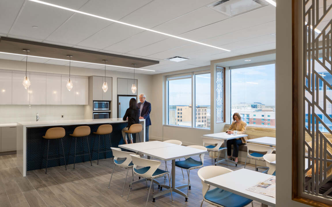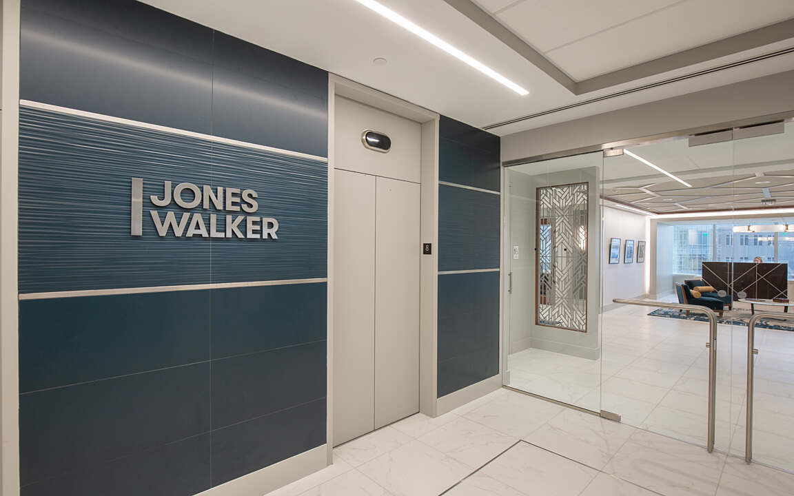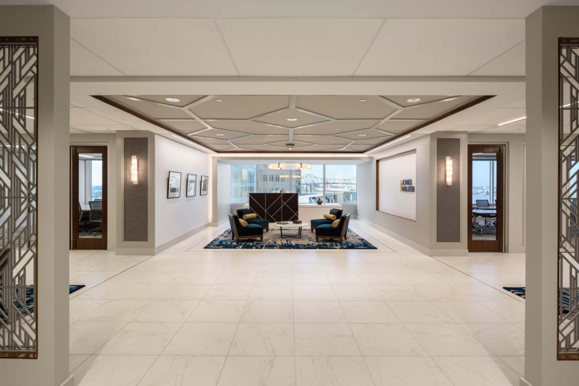 When prominent law firm Jones Walker relocated to downtown Baton Rouge, the firm sought architectural and interior design expertise. In alignment with the law firm’s vision, the design team redesigned a 44,000-square-foot space that spans the two top floors and a partial floor in a historic high-rise office building. The design approach and aesthetic reflect the Jones Walker brand by incorporating modern, flexible office spaces that support collaboration and emerging technologies in a classic color and material palette.