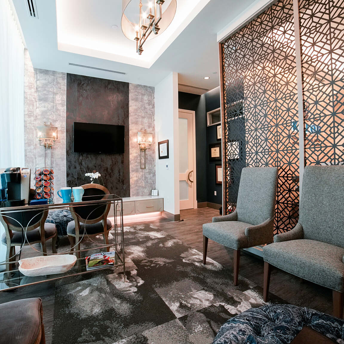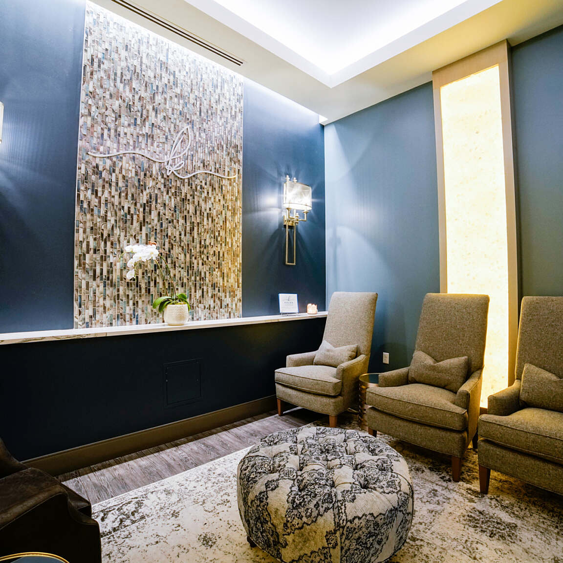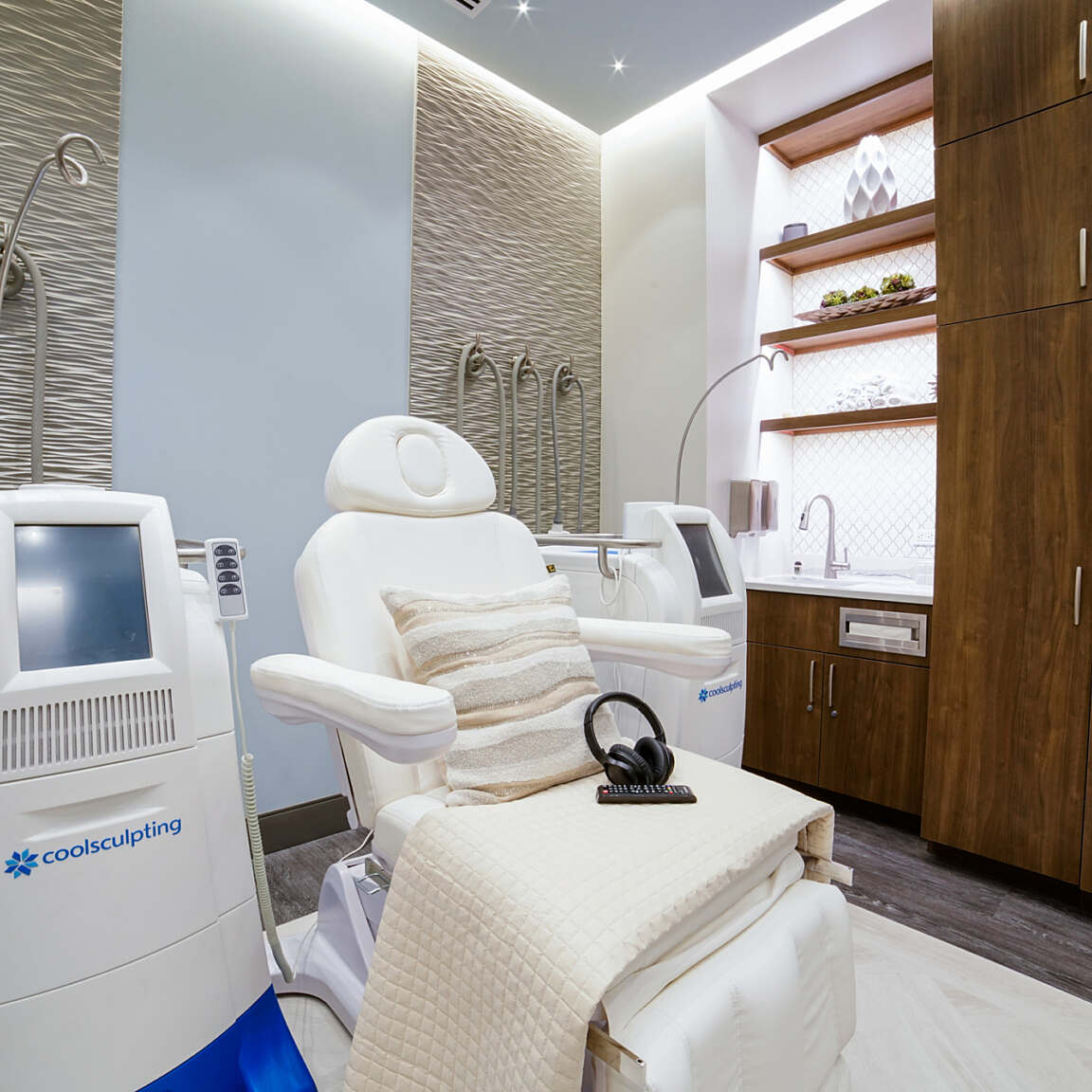 The clinic seamlessly integrates the feel of an upscale retail environment with the functionality of a modern healthcare setting. Warm finishes, refined textures, and custom lighting create a calming atmosphere throughout, while dedicated clinical zones ensure efficiency and privacy for both patients and staff.
