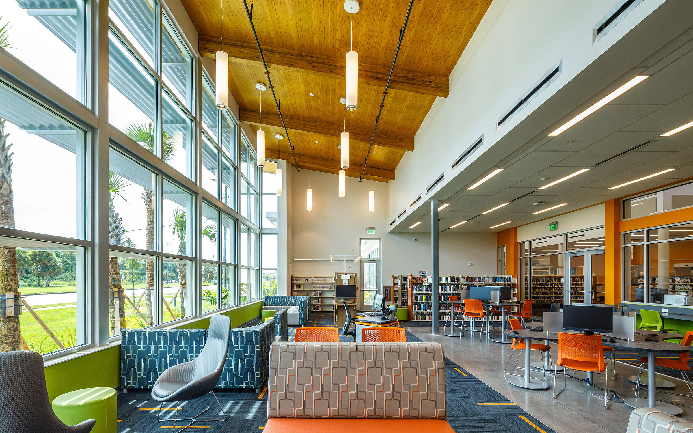 The renovation of the library focused on enhancing both functionality and user experience. Administrative areas, including offices, break rooms, and storage, were updated to create more efficient and comfortable spaces. The circulation and reception area was redesigned to improve accessibility and security. Additionally, a café and coffee shop were added, offering a modern space for visitors to gather, while an outdoor patio expanded seating options. A significant portion of the interior was dedicated to flexible learning spaces, including classrooms designed for technology training and life skills development. These updates provided the library with dynamic spaces to meet the evolving needs of the community.