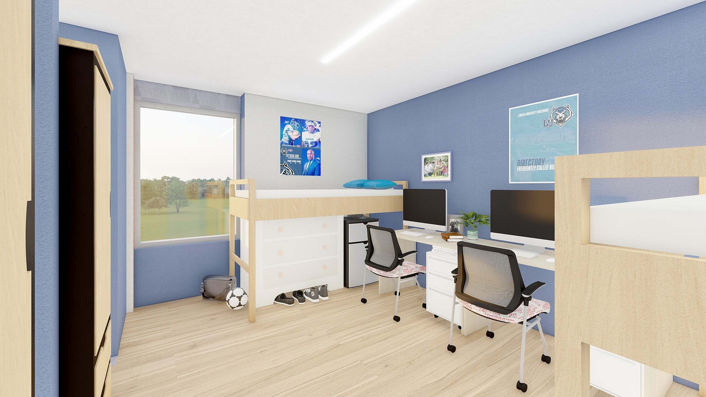 The first level will receive significant renovations to create a welcoming environment for students with a variety of services. Our team is making use of the existing transparency and natural light already available. Students will be greeted with a large lounge to hang out in and study or relax. A large computer lab will be available with seating for 36 students plus offices for private tutoring. A small food service area will be provided for students who wish to eat in the residence hall, as well as a separate kitchen for students to prepare their own meals if they choose.
