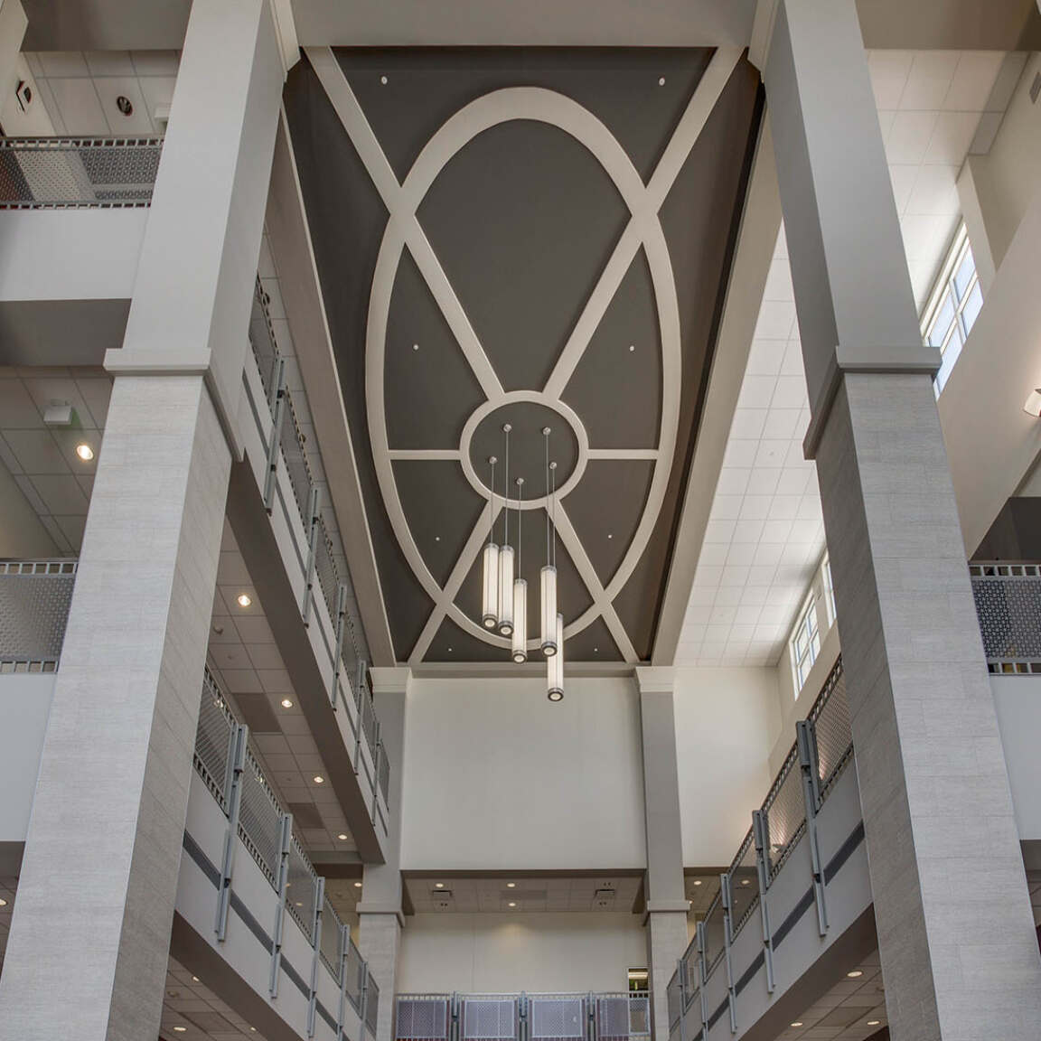 The civically inspired floor pattern used in the lobby is repeated in the soaring ceiling above.