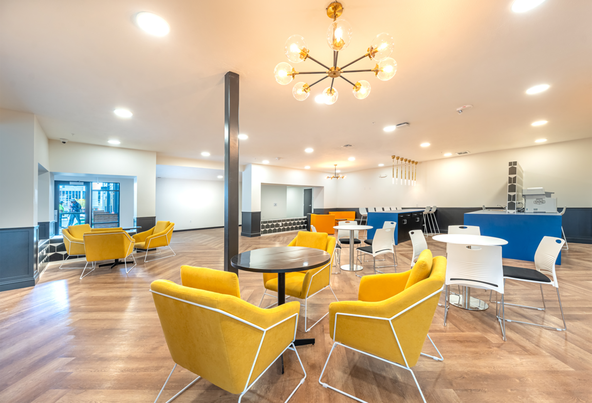 Common spaces are thoughtfully designed to promote both group and individual studying while also serving as vibrant, social areas for students to connect and unwind with their peers.