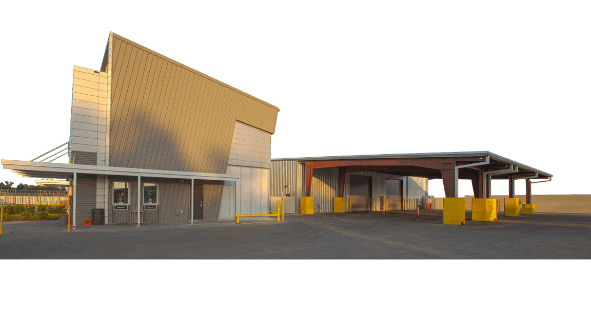 The campus also contains three industrial buildings that accommodate the client’s recycling processes. Each industrial building incorporates a long-span structural design to provide column-free interior expanses, maximizing usable floor space.