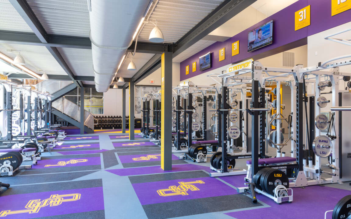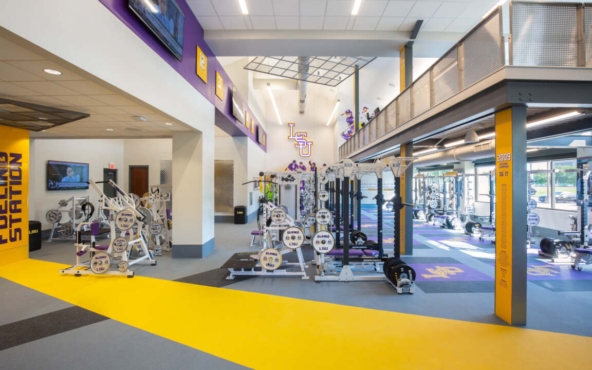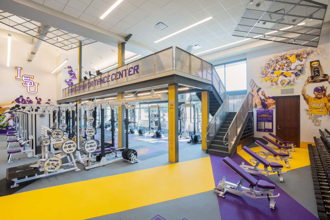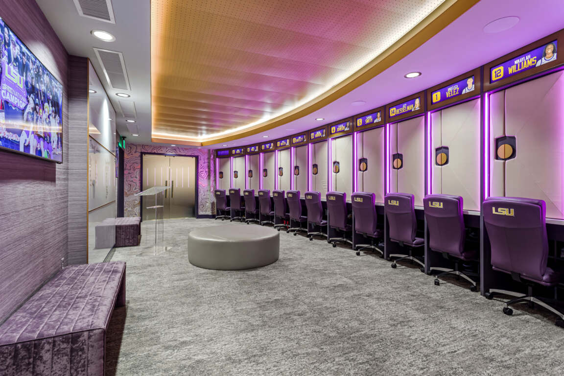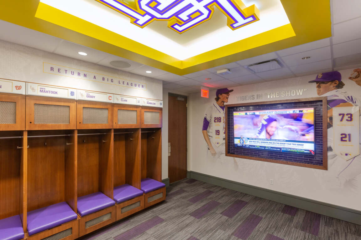The design speaks to the history of the baseball program and its many past and future successes. Through the use of energetic floor patterns, graphics and university colors, the user is instantly aware of LSU’s brand identity.