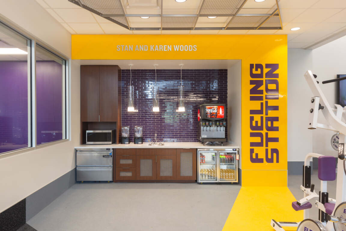 The Fueling Station gives student-athletes and trainers convenient access to food and beverages. It is also located near the head trainer’s office, which provides optimal sightlines throughout the facility.