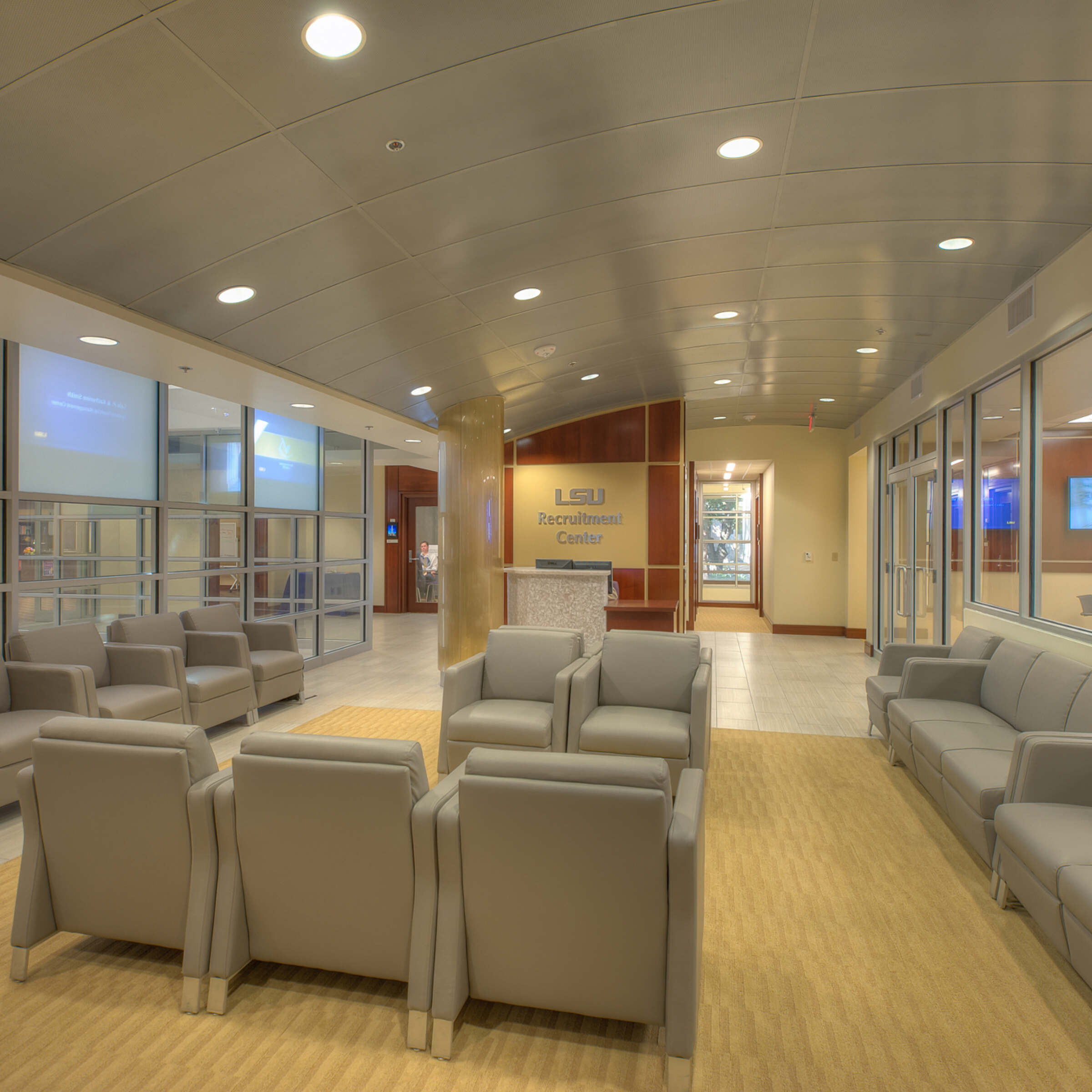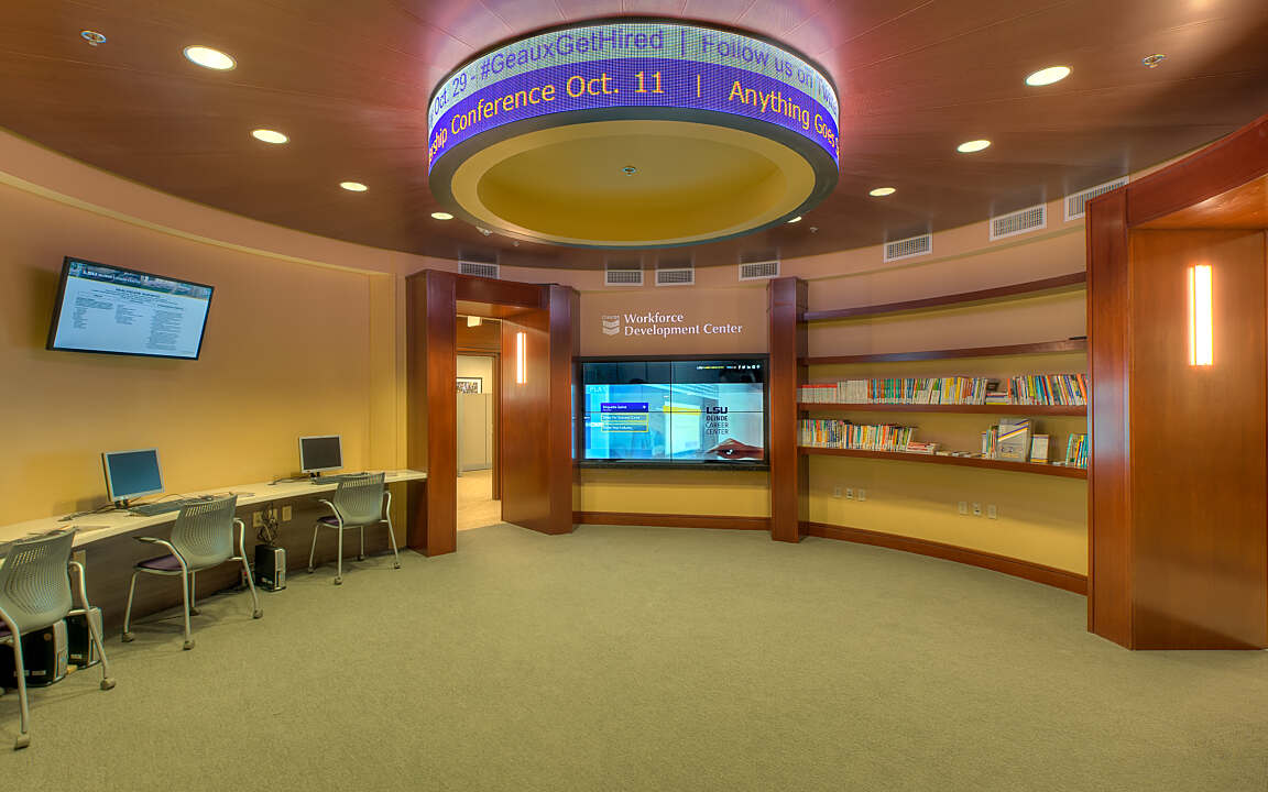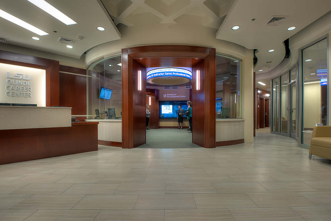 The state-of-the-art, 17,000-square-foot, two-story Olinde Career Center located in the heart of the LSU Student Union, offers education and career advising services. Grace Hebert Curtis Architects created a warm, professional environment for the center that is infused with the latest technology — appealing to multiple generations of the LSU community as well as local partners.