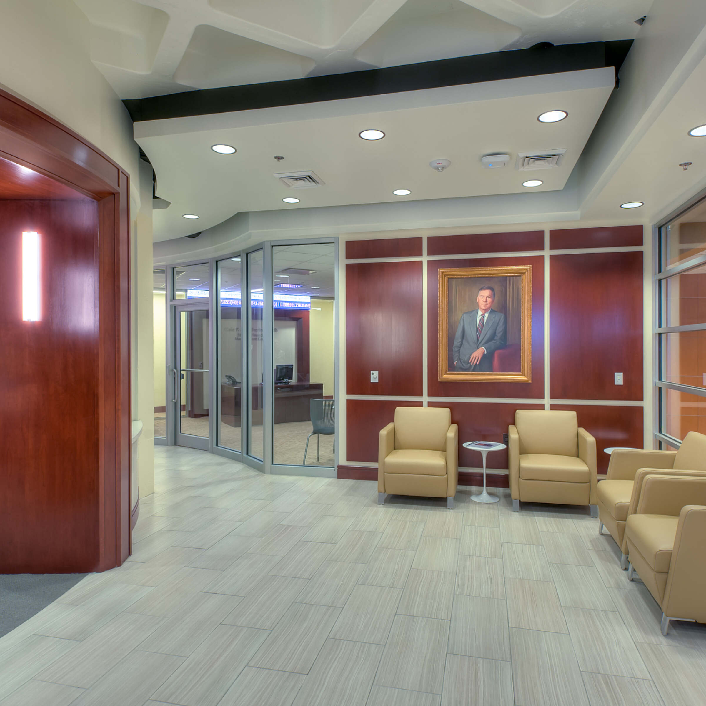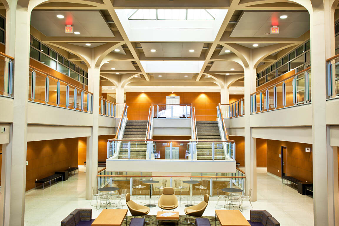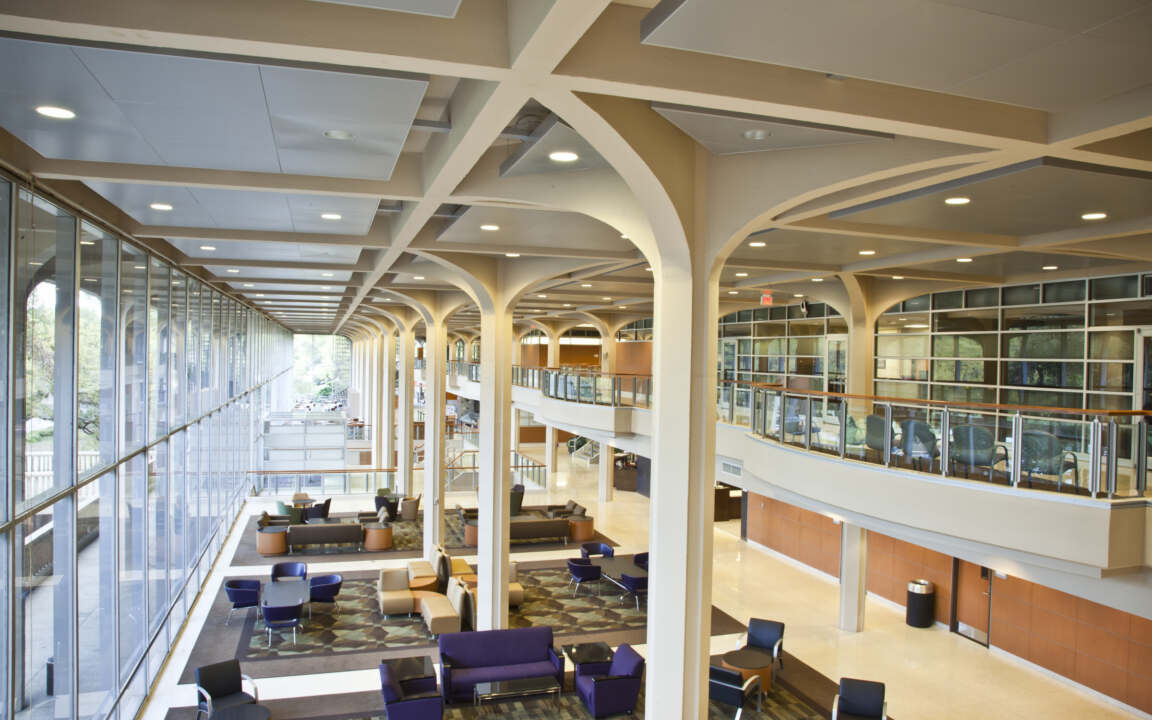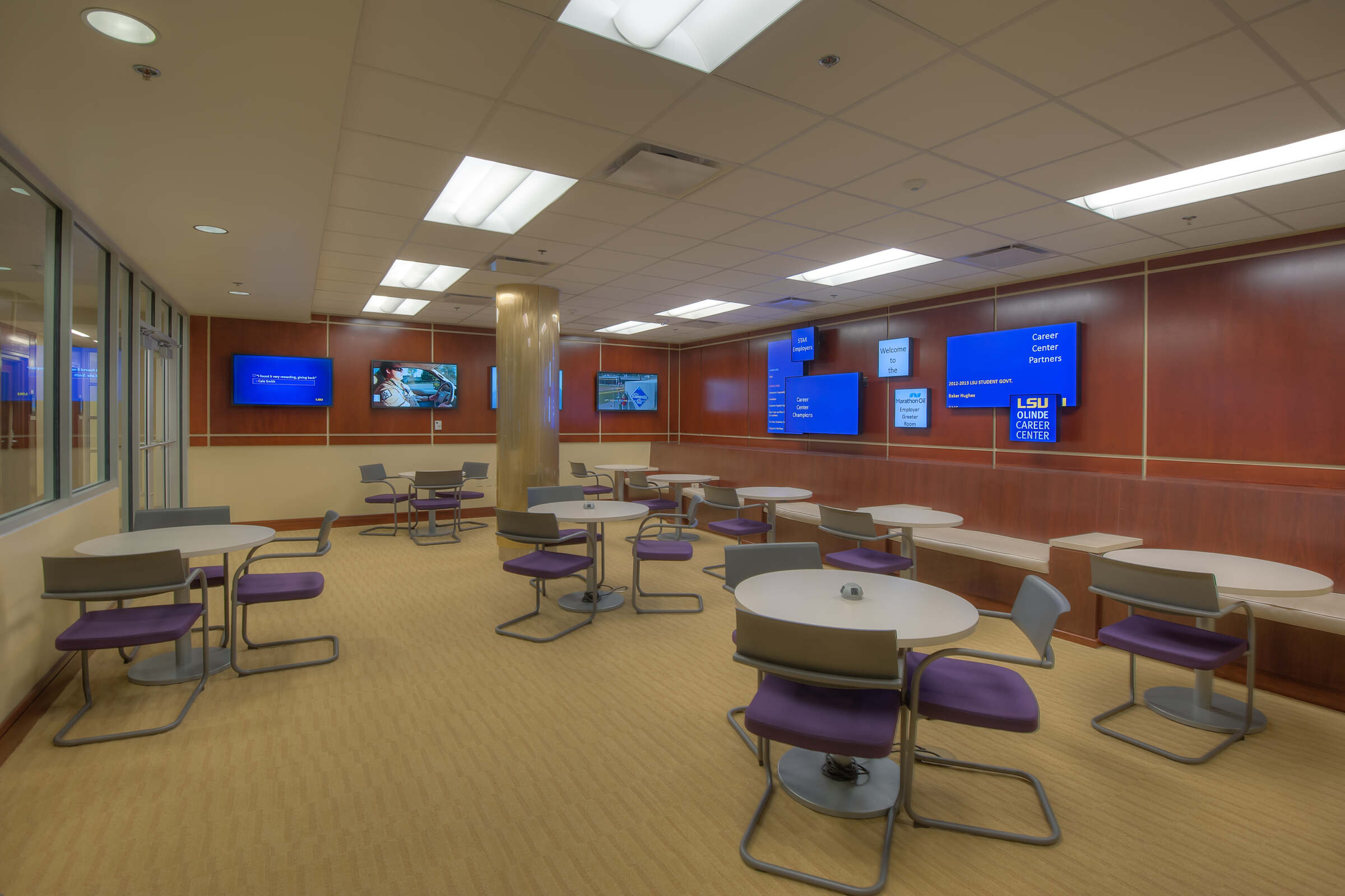 The state-of-the-art, 17,000-square-foot, two-story Olinde Career Center located in the heart of the LSU Student Union, offers education and career advising services. Grace Hebert Curtis Architects created a warm, professional environment for the center that is infused with the latest technology — appealing to multiple generations of the LSU community as well as local partners.