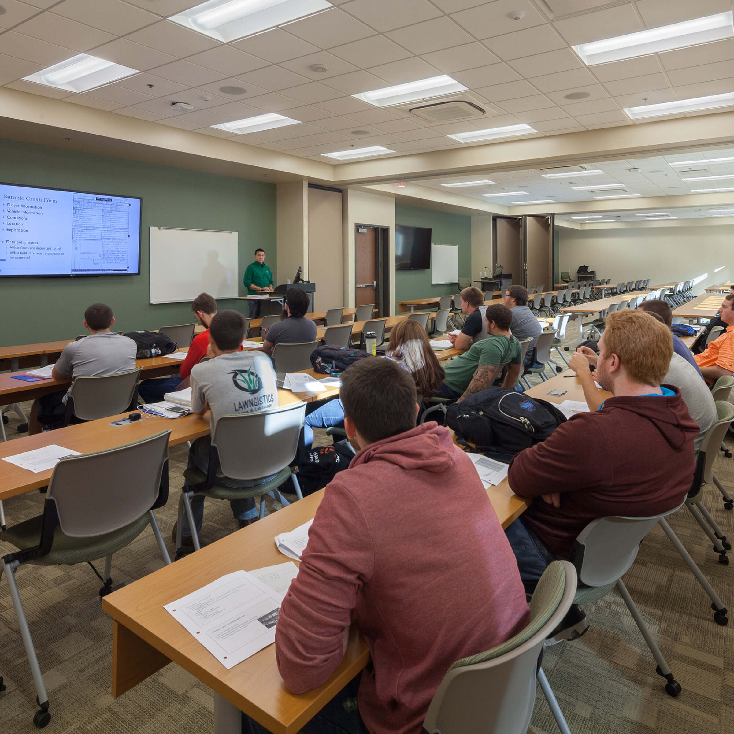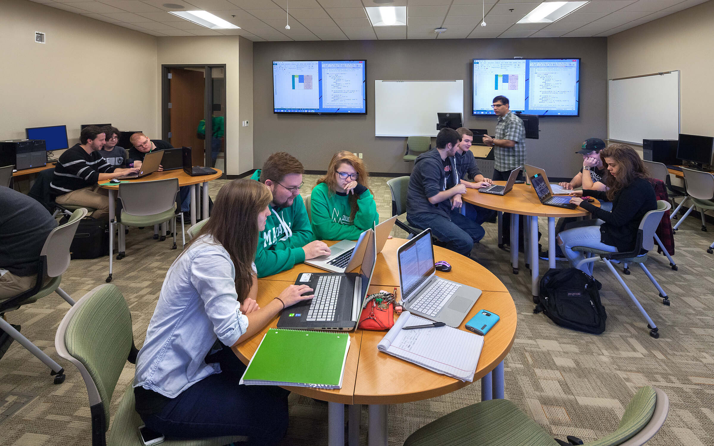 One of the building’s highlights is the Advanced Material Testing Laboratory—an exceptional facility with a concrete floor built to resist 50,000 pounds of force. This lab is among only a few of its kind in the United States and includes observation windows that allow students and visitors to witness testing in real time. The complex includes a variety of labs and support spaces that accommodate engineering, science, mathematics, and computer science programs. Safety laboratories are integrated throughout to support academic instruction and research across departments.