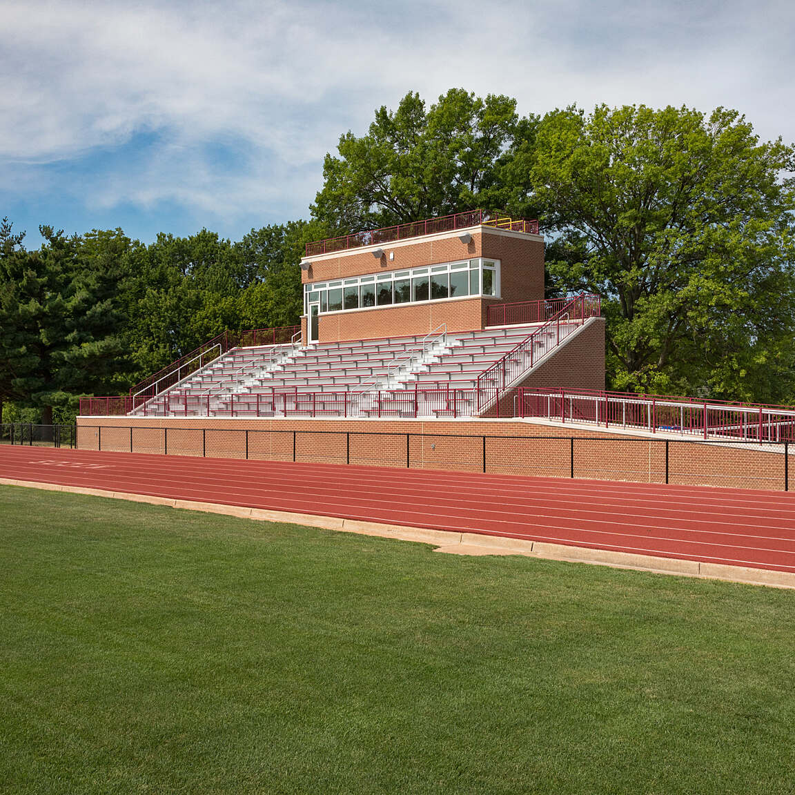 The existing Track and Field Stadium, formerly the football stadium, was rebuilt as the Holekamp Track and Field Stadium and can accommodate 400 fans. The Stadium is the new home for the track and field team and includes the addition of a small press box and a new synthetic high jump area in the end zone of the existing track. Designers raised the first row of seats to four feet above the field to allow spectators better visibility. The existing grass field will be used for Junior Varsity practice as well as physical education classes and general recreation.