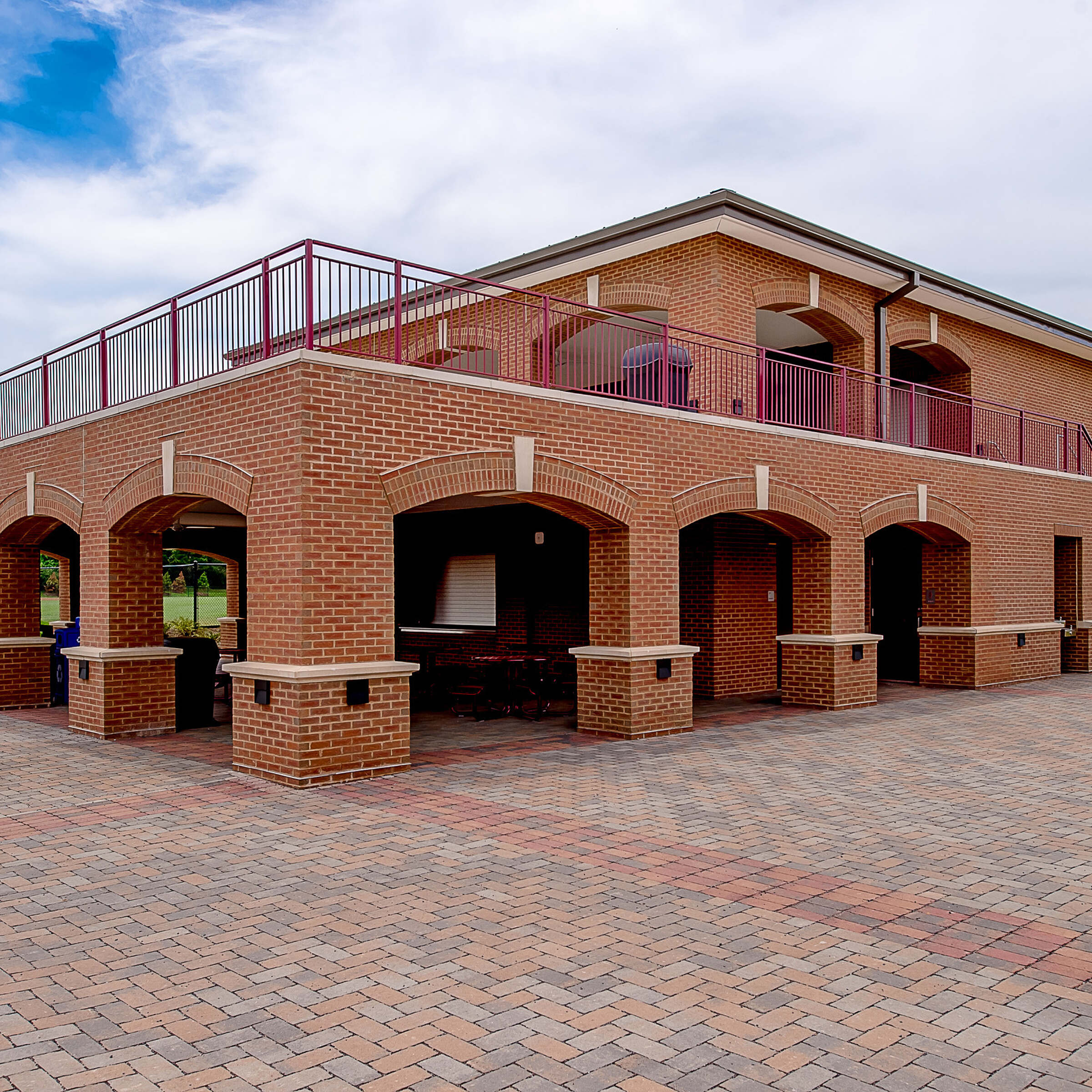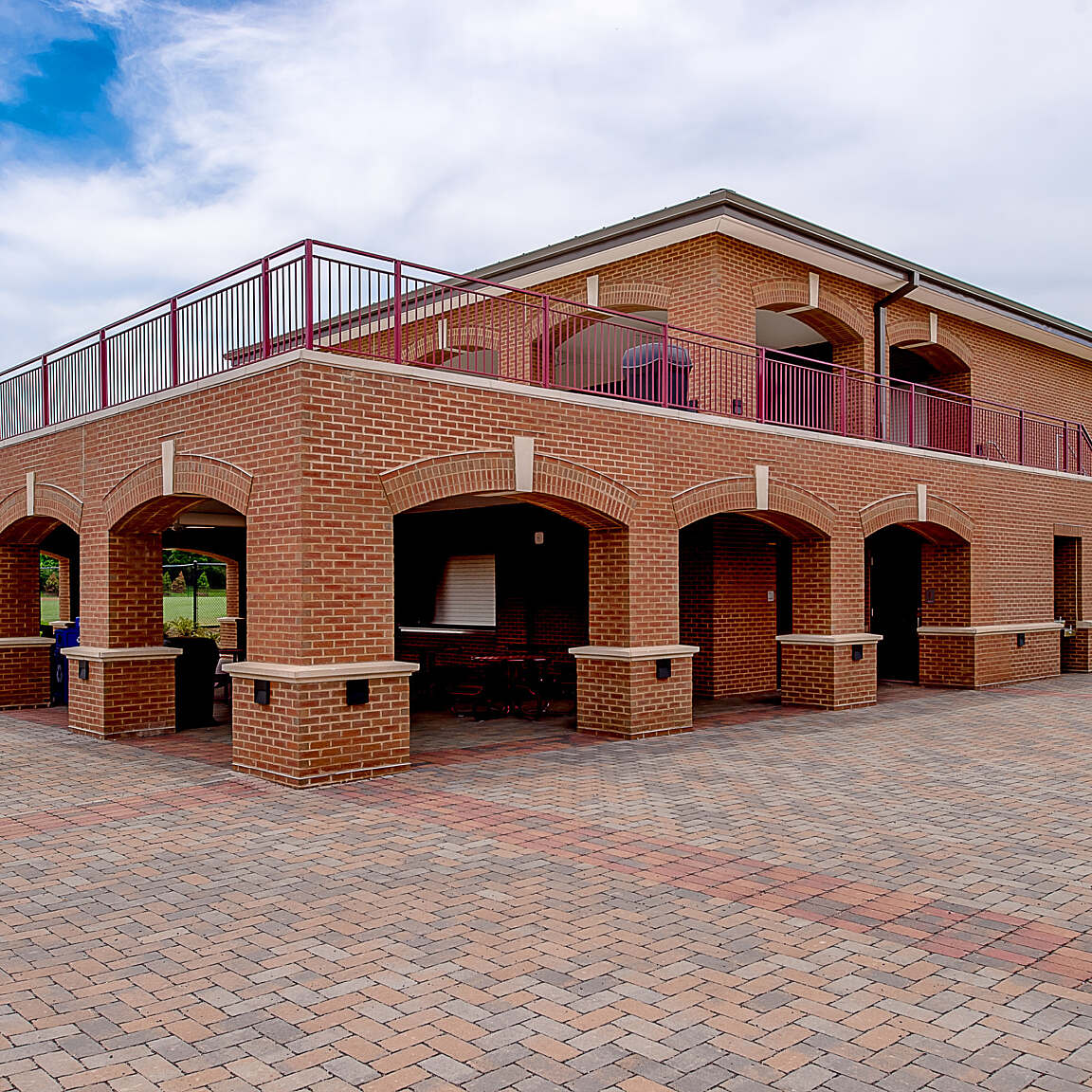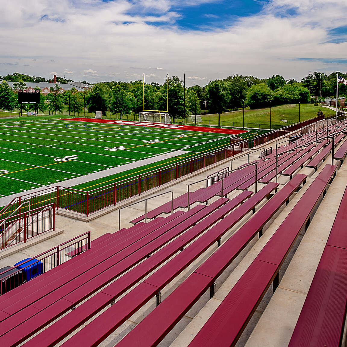 The turf field means decreased downtime and maintenance requirements compared to the old grass field. Built into a hillside, the facility takes advantage of the slope for the grandstands. The configuration allows students and spectators to enter the stands from behind and the team rooms are at the field level keeping spectators and participants separate.