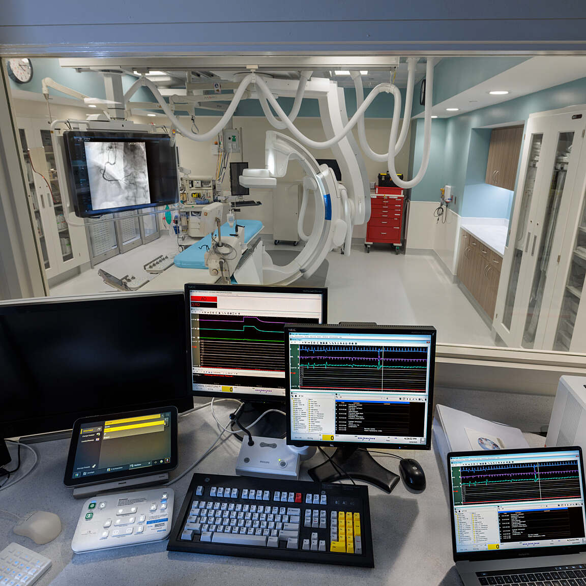 Furthermore, we prioritized the replacement of all existing lights with energy-efficient LED fixtures, aligning with sustainability principles while meeting the functional requirements of the Cath Labs. The team also addressed miscellaneous electrical work as dictated by the functional program, ensuring that the lighting and electrical systems were optimized to support the operation of the new equipment and enhance the overall workspace environment.