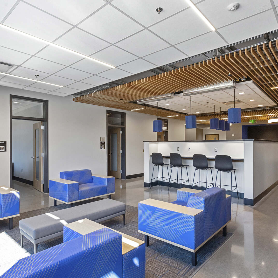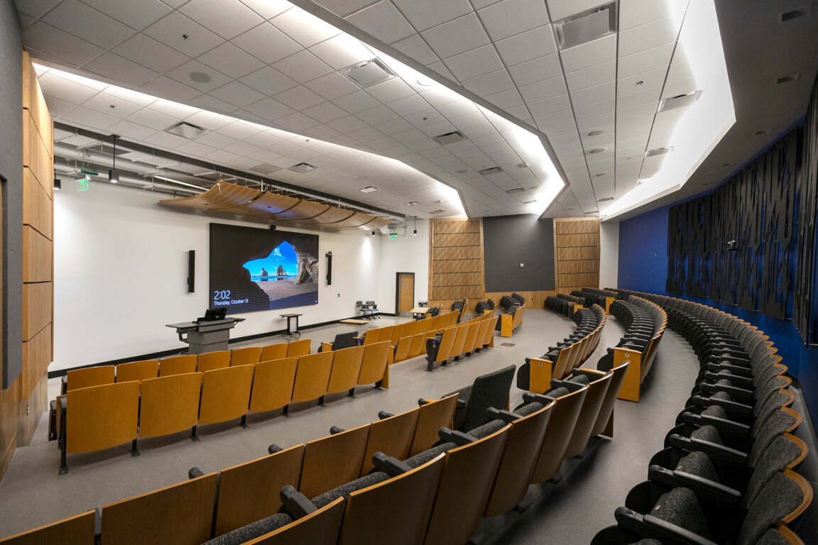 Lecture rooms feature tiered seating to enhance visibility and engagement during presentations, creating an ideal environment for learning. Rooms are equipped with advanced technology to support interactive instruction and presentations. Warm wood accents and recessed lighting add a refined, contemporary aesthetic that complements the building’s overall design.