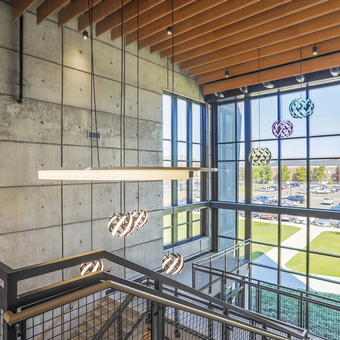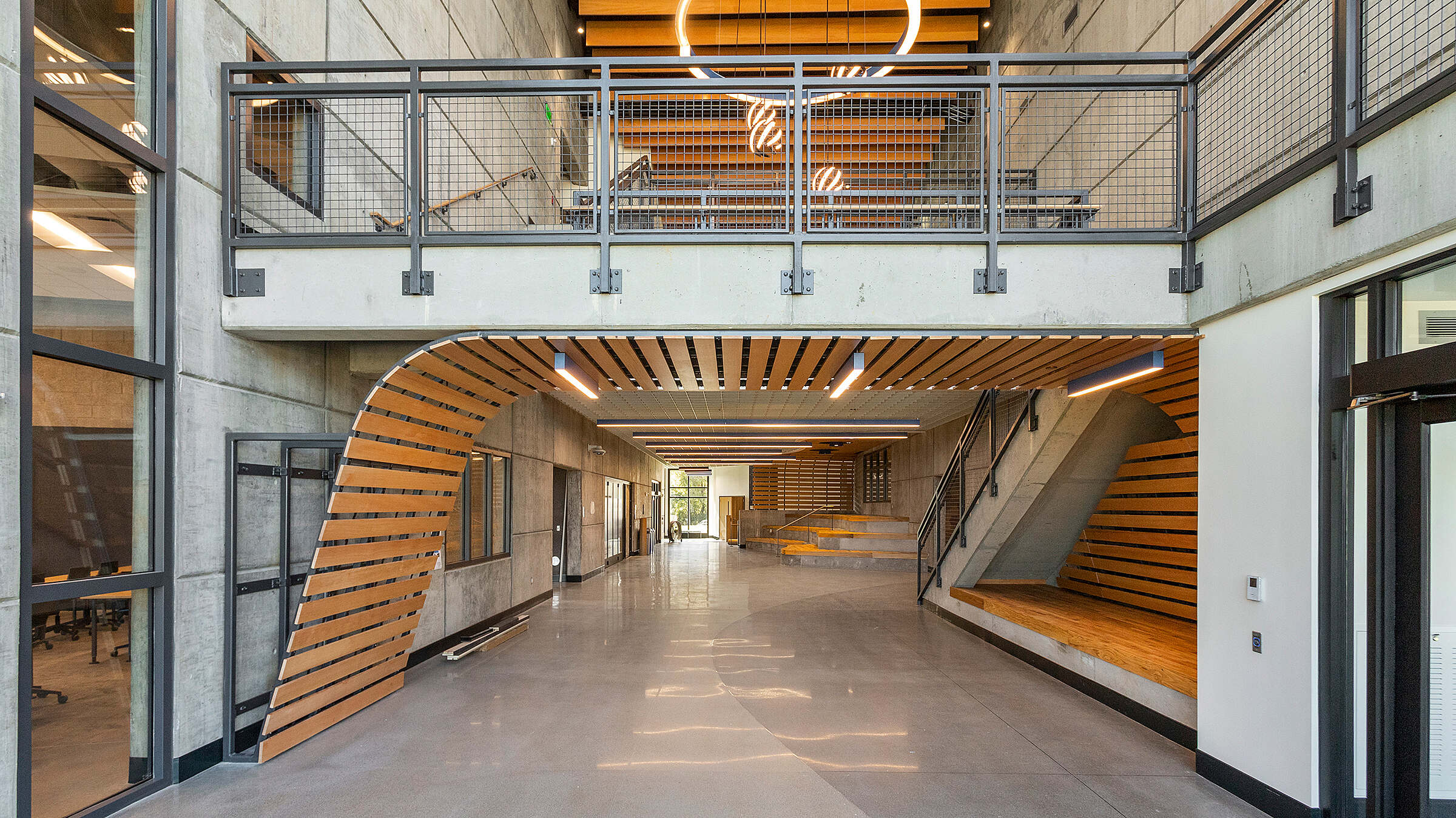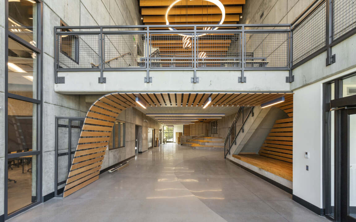 The building is organized around the central atrium with distinct zones for office and industry events to one side and labs to the other, to isolate activity and acoustic needs. Windows provide safe views into college specific rooms from public areas to encourage everyone to be curious, ask questions and learn about the concrete industry. The upper floor alternates between classrooms, faculty offices and active and quiet lounges to promote interaction between the faculty and students and to provide ample space for students to use this area as their home on campus.