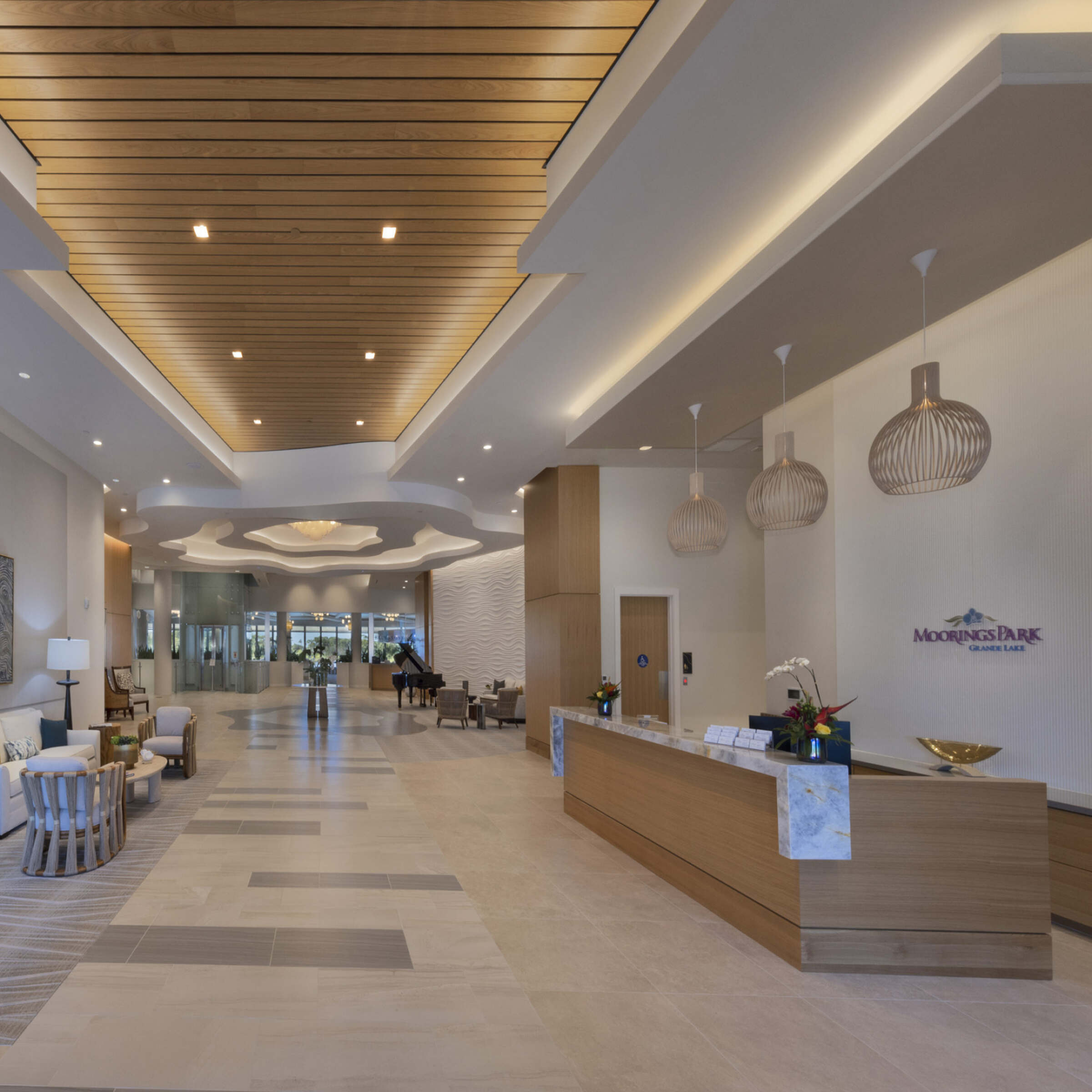 The Moorings Park Grande Lake Clubhouse and Residence Tower is the second phase of a multi-phased new master planned continuing care residential community located on 55 acres adjacent to Naples Grande Golf Club. The high rise building is a mixed use of amenities, a resort style pool and deck and 16 private residences.