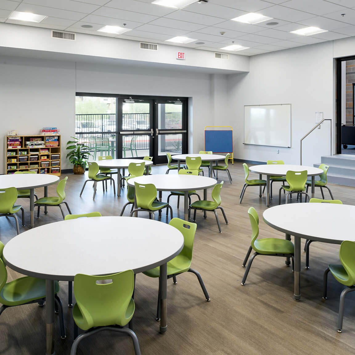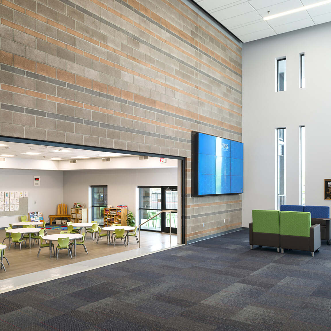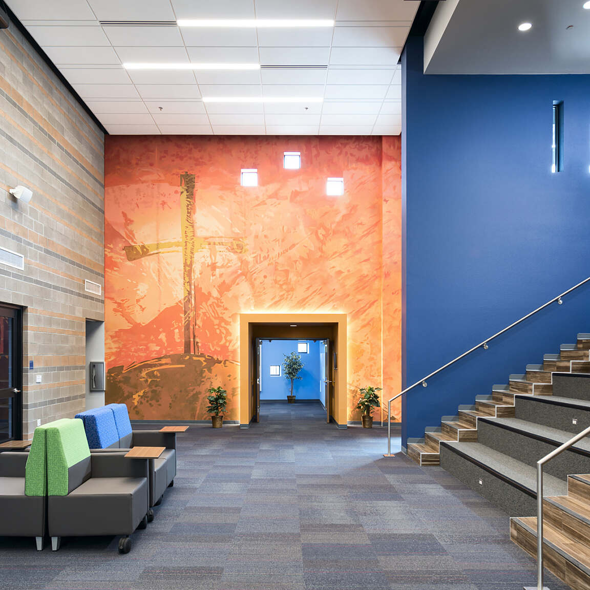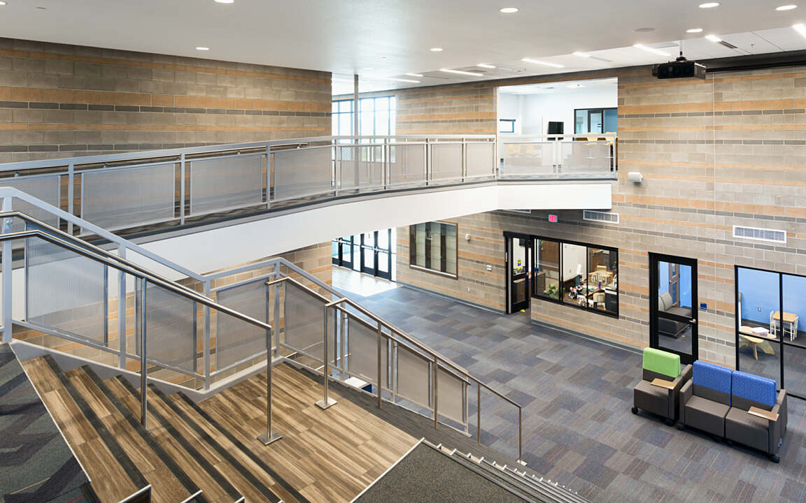 North Valley Christian Academy's primary design goal was to create a 21st century learning environment containing flexible learning spaces with a meaningful connection to the out-doors. To that end, every classroom has a direct connection to a covered patio or balcony. Likewise, on the interior, each classroom adjoins a wide hallway programmed with additional breakout learning spaces. This allows classroom instruction to spill out to both the interior and exterior of the building, while maintaining a visual connection to the primary classroom space. Recognizing that students also need quiet places to collaborate, small enclosed study rooms are placed in between adjacent classrooms. The breakout spaces are outfitted with interactive, touchscreen technology to allow for both large group instruction and student collaboration. These breakout areas utilize movable furniture, enabling the space to be reconfigured as needed. A double height lobby also functions as a student commons with a variety of furniture types as well as patio access. Within this space is a wide grand stair containing additional seating elements. The grand stair can function as an informal study space for individual students or accommodate a large group for a lecture or student presentation.
