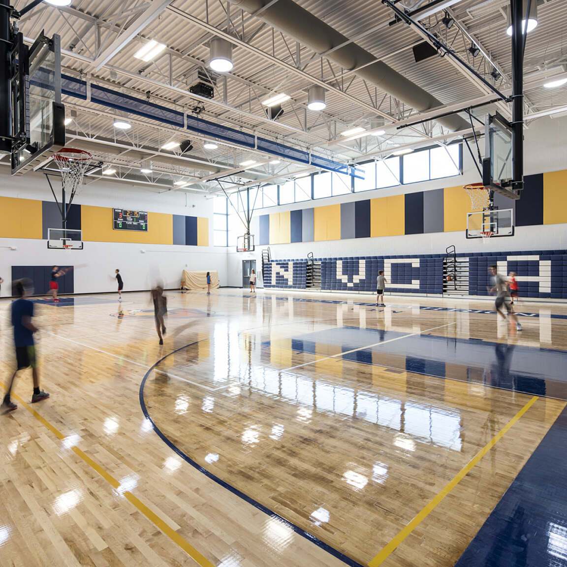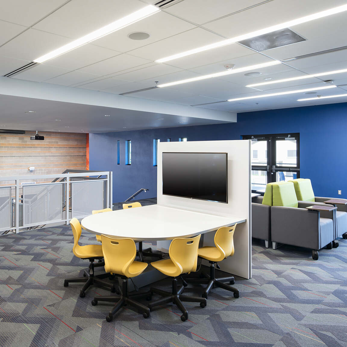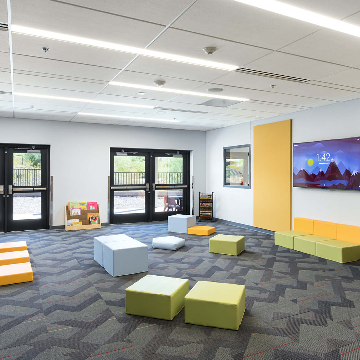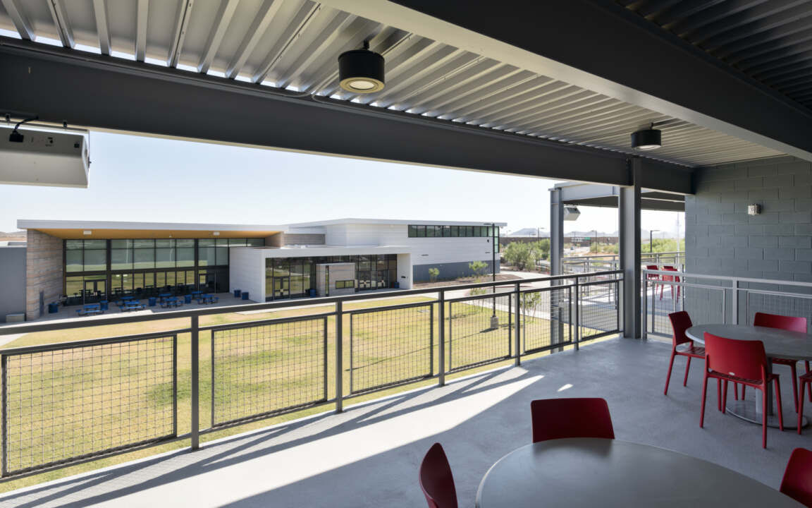 North Valley Christian Academy's primary design goal was to create a 21st century learning environment containing flexible learning spaces with a meaningful connection to the out-doors. To that end, every classroom has a direct connection to a covered patio or balcony. Likewise, on the interior, each classroom adjoins a wide hallway programmed with additional breakout learning spaces. This allows classroom instruction to spill out to both the interior and exterior of the building, while maintaining a visual connection to the primary classroom space. Recognizing that students also need quiet places to collaborate, small enclosed study rooms are placed in between adjacent classrooms. The breakout spaces are outfitted with interactive, touchscreen technology to allow for both large group instruction and student collaboration. These breakout areas utilize movable furniture, enabling the space to be reconfigured as needed. A double height lobby also functions as a student commons with a variety of furniture types as well as patio access. Within this space is a wide grand stair containing additional seating elements. The grand stair can function as an informal study space for individual students or accommodate a large group for a lecture or student presentation.