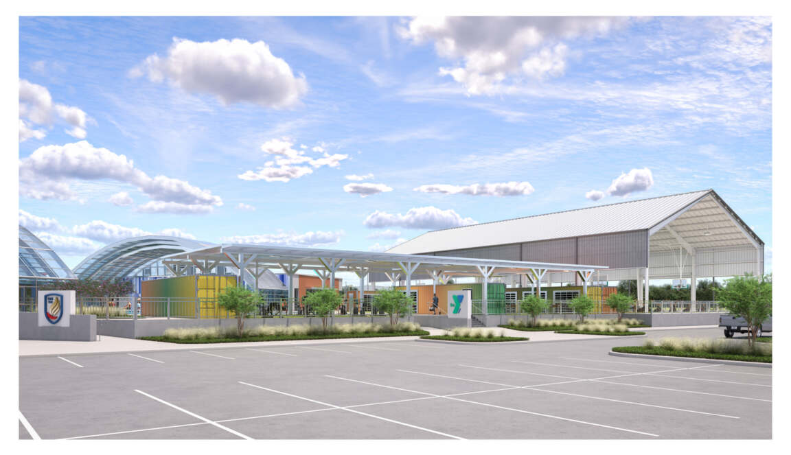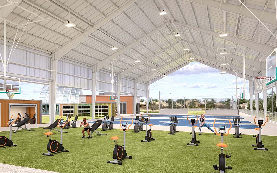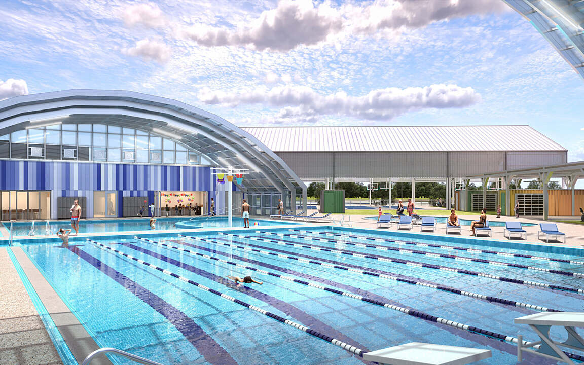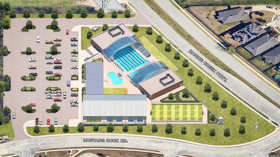 The Northwest YMCA Fort Worth is a 10-acre recreational facility adjacent to Eagle Mountain Schools and the Administration Building, featuring 200 parking spaces and a direct connection to a fenced-in YMCA site. A spacious entry plaza leads to the natatorium, which includes a 25-yard by 25-meter competition pool, a warm water therapy and play pool, and locker rooms for YMCA members and Eagle Mountain ISD swim teams. Its retractable DynaDome polycarbonate roof allows for year-round use. Adjacent amenities include a splash pad, an outdoor fitness area with artificial turf and modular storage buildings, and an open-sided metal structure for basketball, pickleball, and fitness activities. To the south, a mini-pitch enclosed soccer field with artificial turf supports both soccer and multisport activities.
