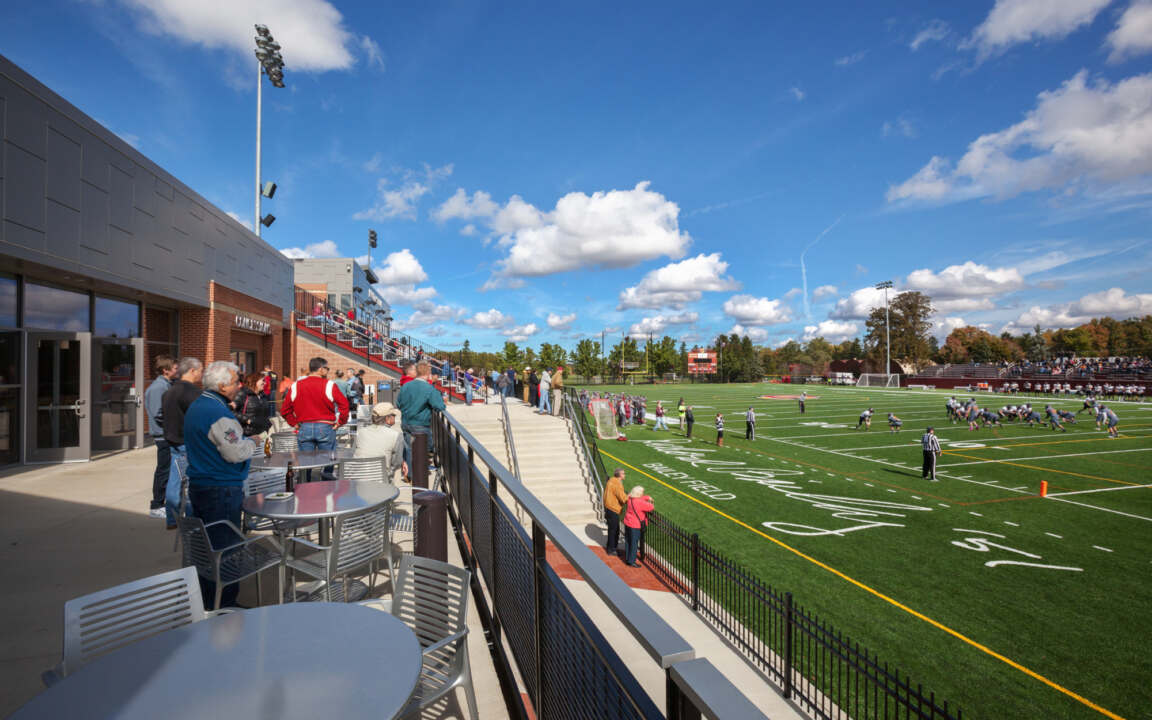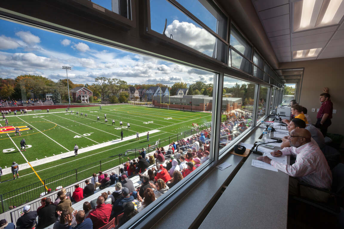 The project includes an alumni club room with exceptional views of the field, a press box and concessions. In addition, the facility includes a 3,000 SF conference space that is able to be subdivided as needed. The meeting room is branded with the Oberlin logo and school colors, and includes large overhead projectors, flat screen TVs, and a bar.