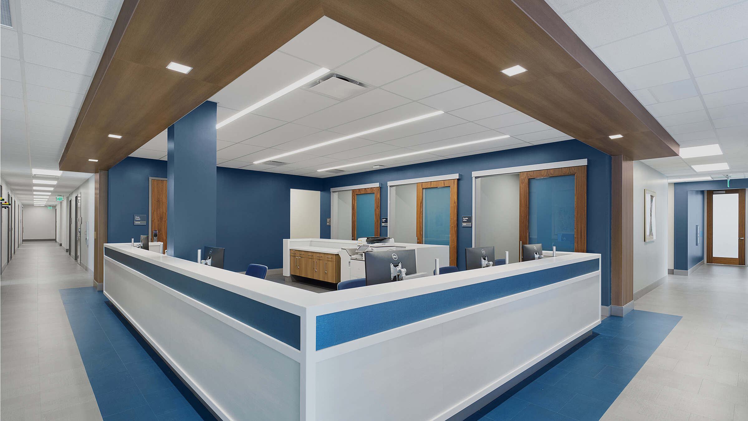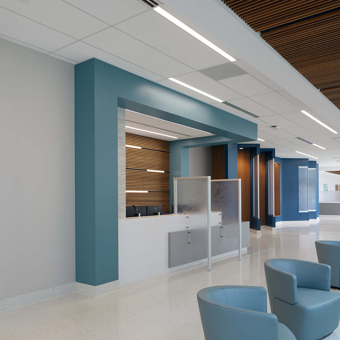 Patients walk into a calming color palette and warm wood finishes through the main entrance. Ample daylight provides a comfortable, healing aesthetic for patients receiving care as well as long term benefits for healthcare staff.