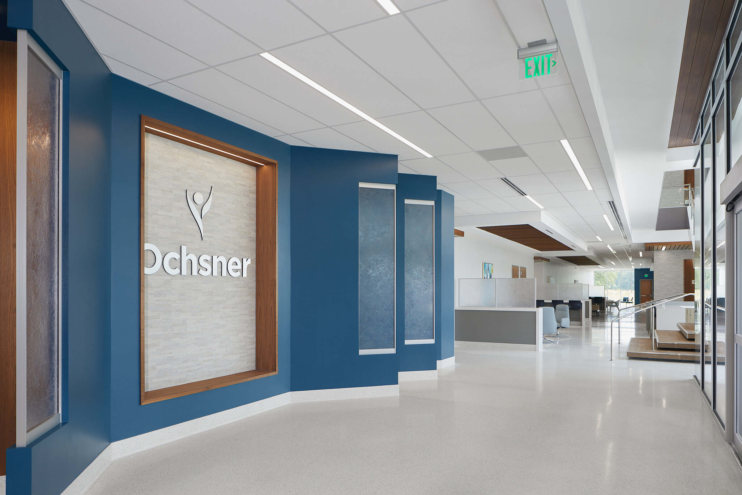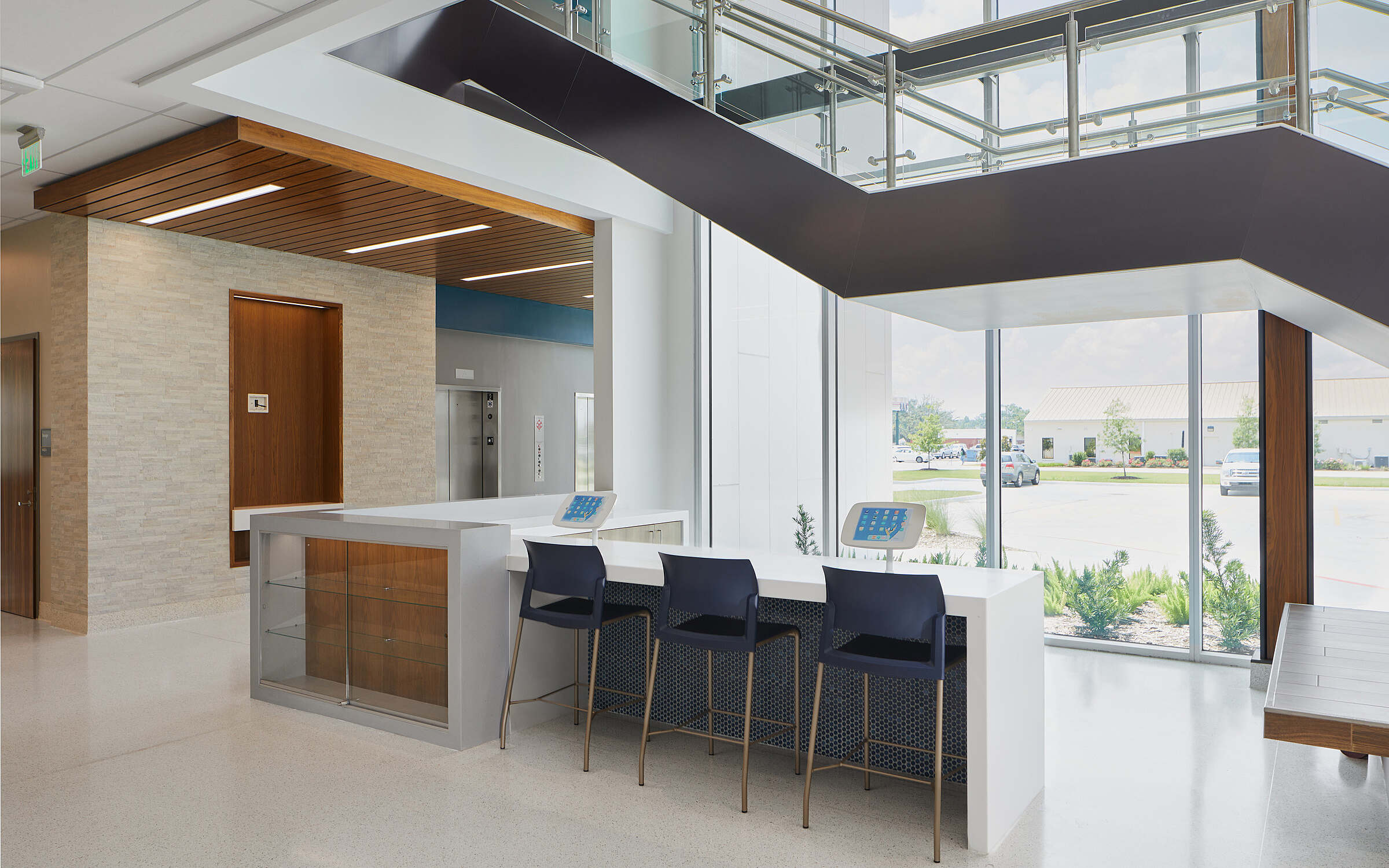 A grand staircase, which serves as the building’s focal point, greets patients upon arrival. The lobby features a variety of patient seating and a reception area accompanied with natural light that illuminates the space. Ochsner’s cutting edge and interactive healthcare technology can be accessed at their signature O-Bar located beneath the stair.