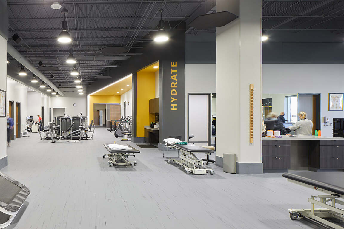 The project showcases GHC’s growing leadership in the Therapy & Wellness sector, specifically with regard to performance-training equipment, finishes and space planning. Color, materials, and subtle structural elements (including ceiling details between the locker rooms and Hydration Station) designate and define therapy areas and help patients orient themselves within the open-plan gym. To further communicate the building’s mission, GHC integrated numerous large windows to draw in energizing natural light, which is amplified by mirrors along the perimeter of the gym. An automatic sliding door ensures that patients with less mobility can move between the lobby and gym with ease.
