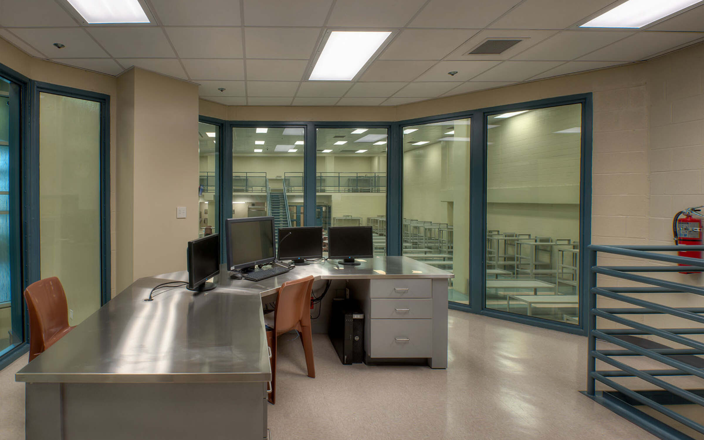 The new concrete-framed, eight-story housing structure with intermediate mezzanines contains celled and open dormitories of varying custody levels to accommodate 1,438 inmates. Exercise yards are adjacent to each housing unit to introduce fresh air and natural light into the dayrooms. All housing pods have adjacent control rooms, and a secure sally port that leads directly into holding and processing areas streamlines inmate movement.