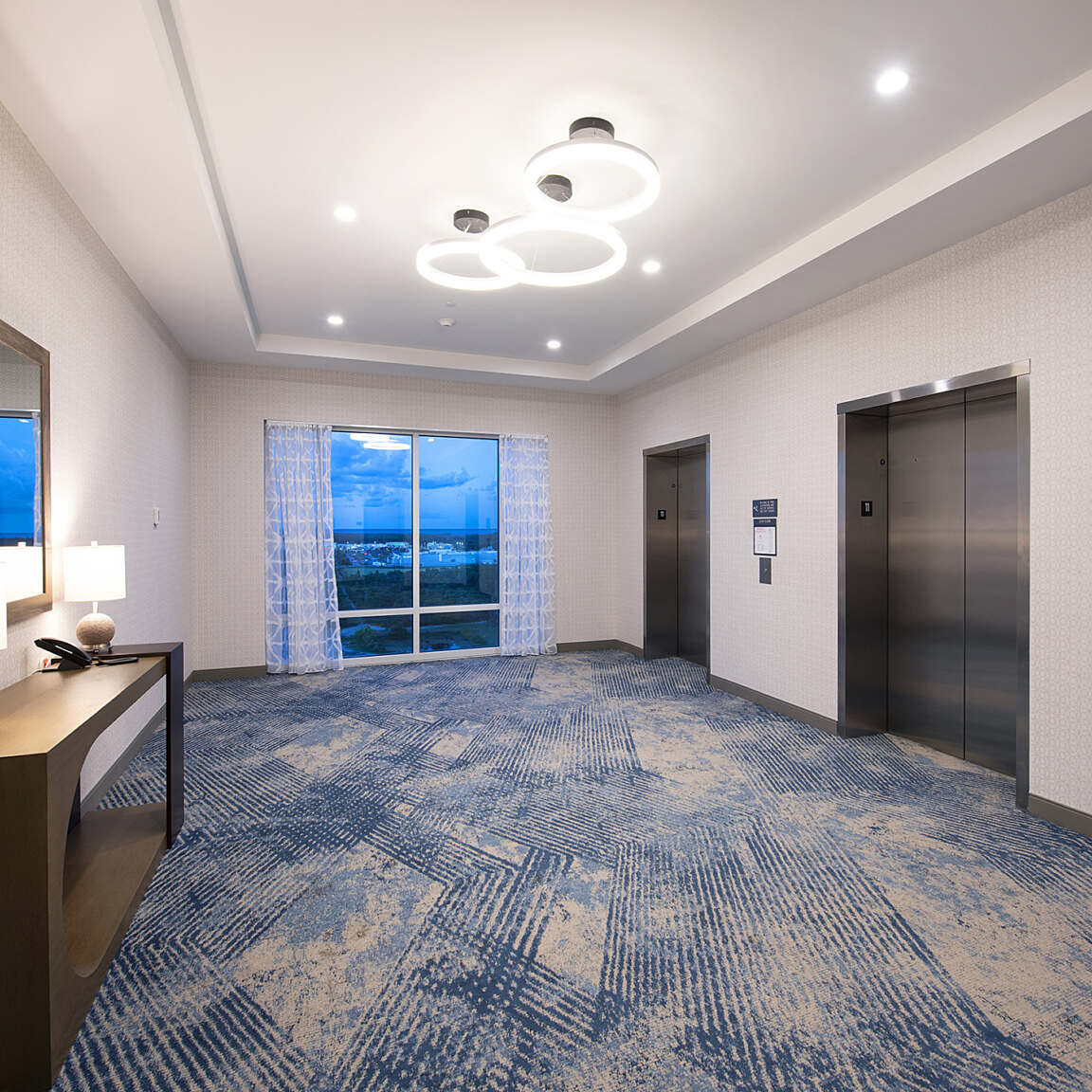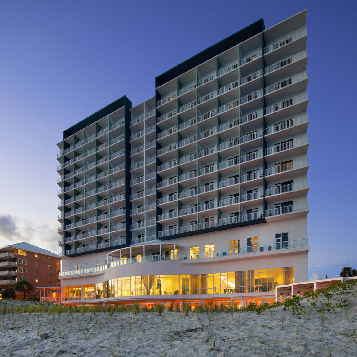 The OTO Hyatt Place, a modern and vibrant retreat, welcomes guests with ample space spread across its impressive 12-story building. Situated on the beachfront, this resort not only features a structured parking deck but also showcases a state-of-the-art roundabout drop-off area, providing a grand entrance with stunning views of the adjacent beach. The lobby, strategically positioned on the third floor, offers an unparalleled experience with breathtaking 180-degree views of the beach through its floor-to-ceiling windows, setting the tone for a memorable stay.