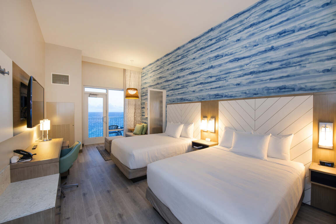 Adorned with blue and white accents, guest rooms offer an ideal space for guests to unwind while enjoying beautiful beach views.