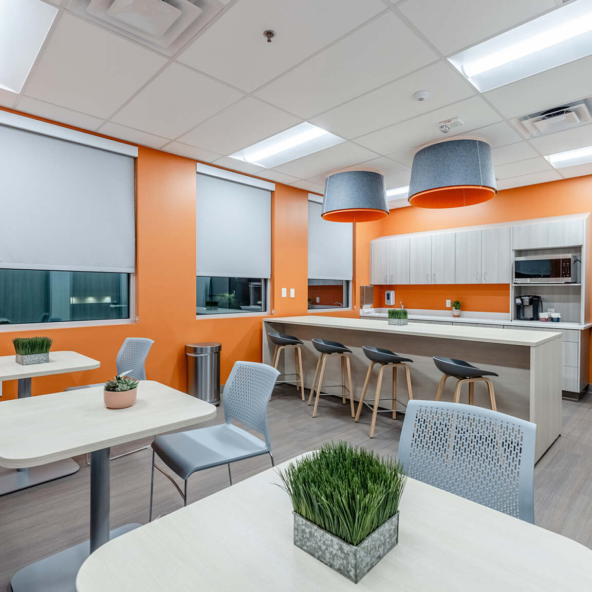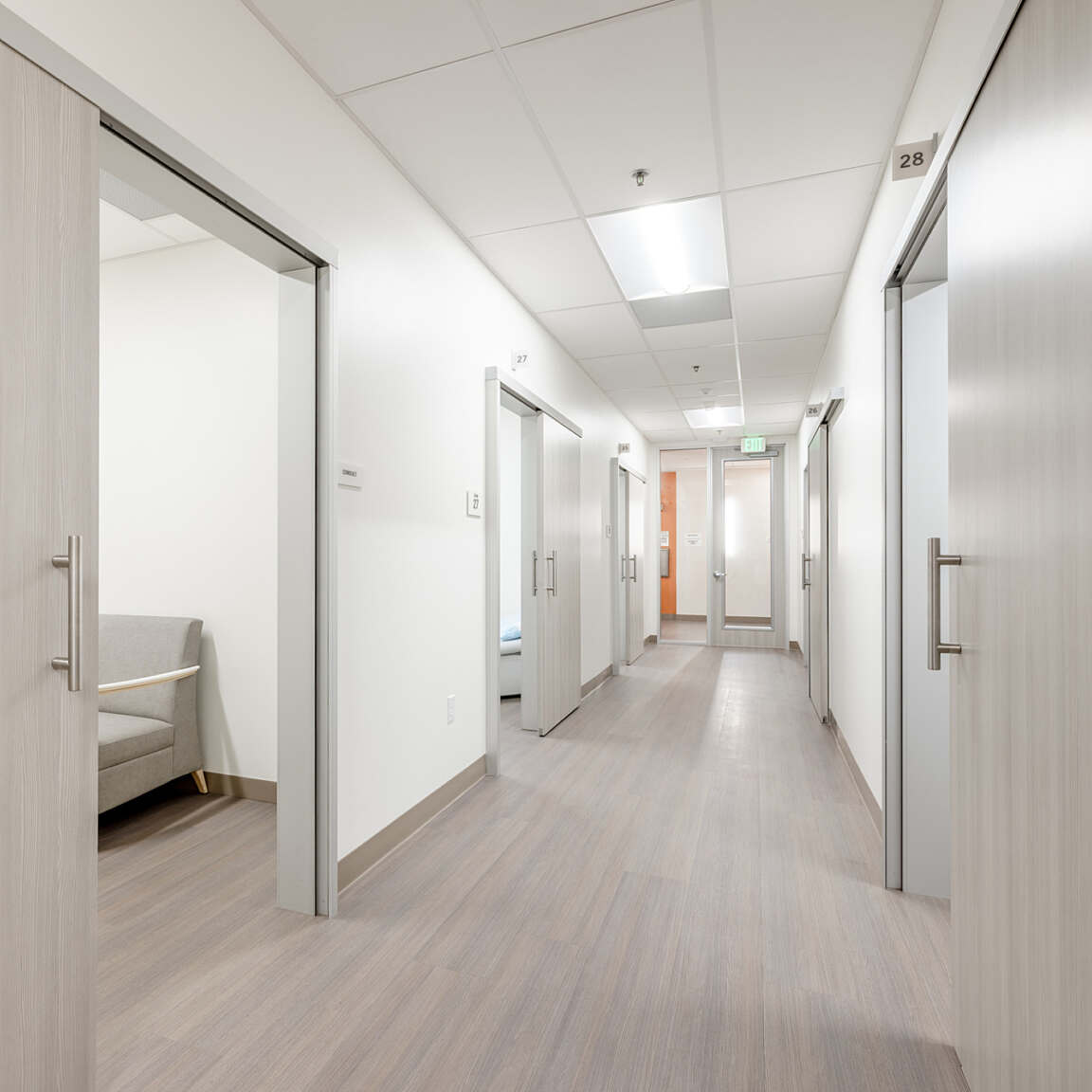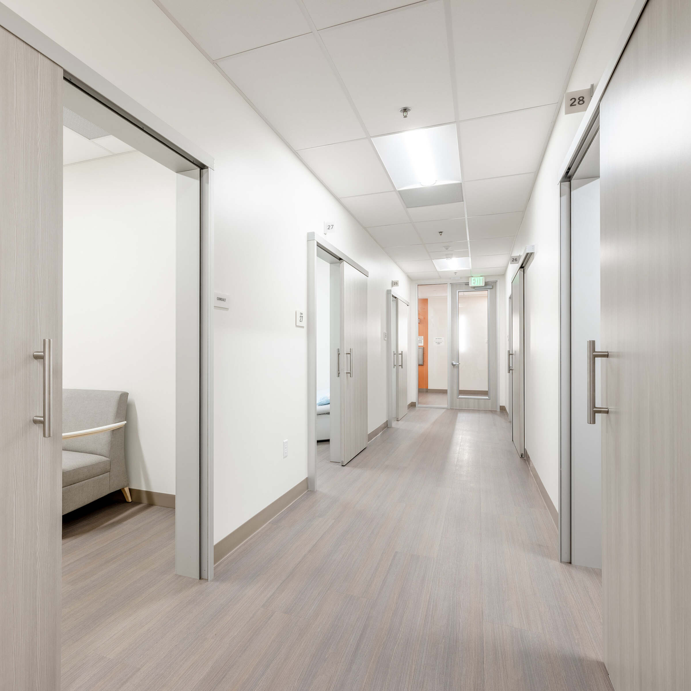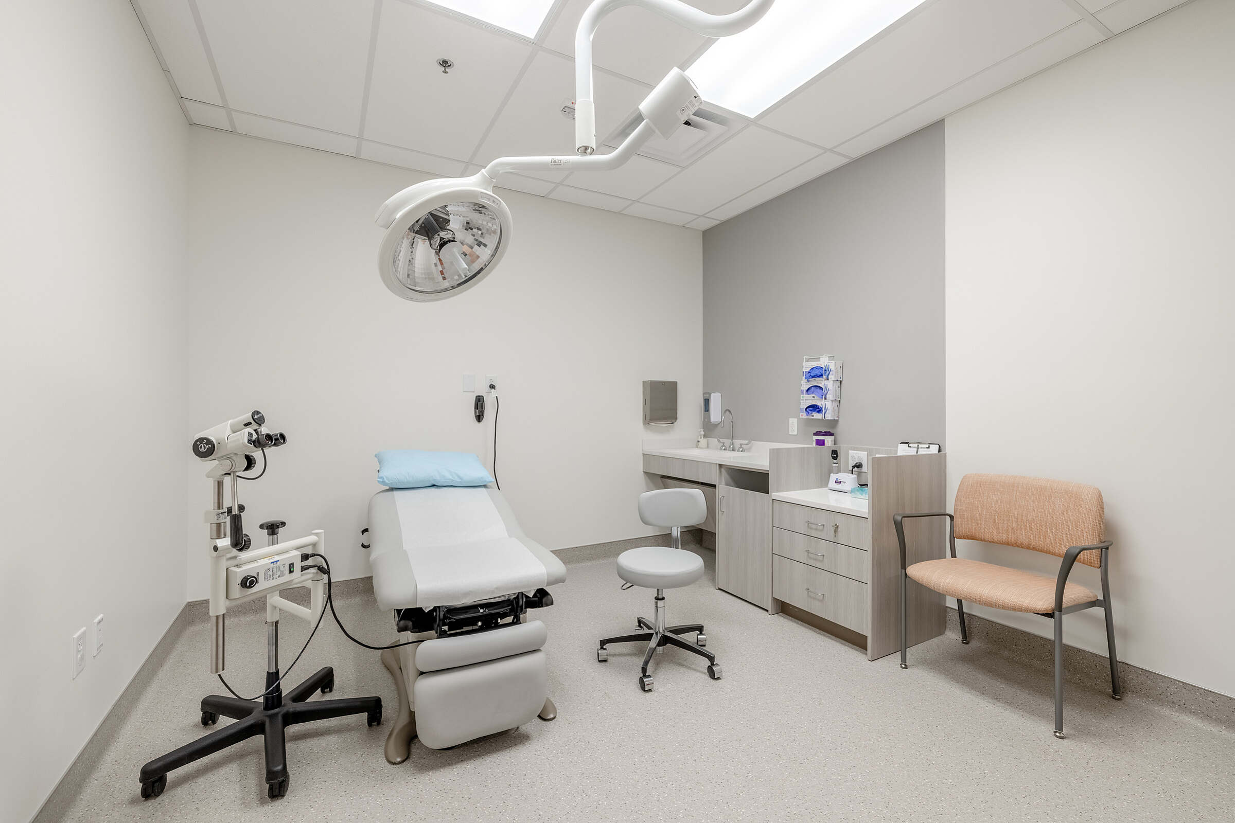 Exam rooms feature neutral color palettes that create a soothing atmosphere for patients. Thoughtful interior finishes contribute to a sense of comfort and ease, supporting a positive care experience.