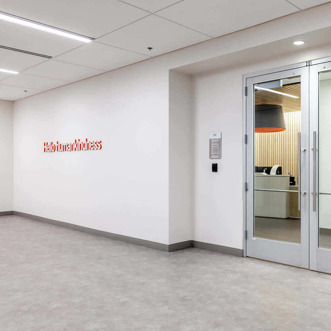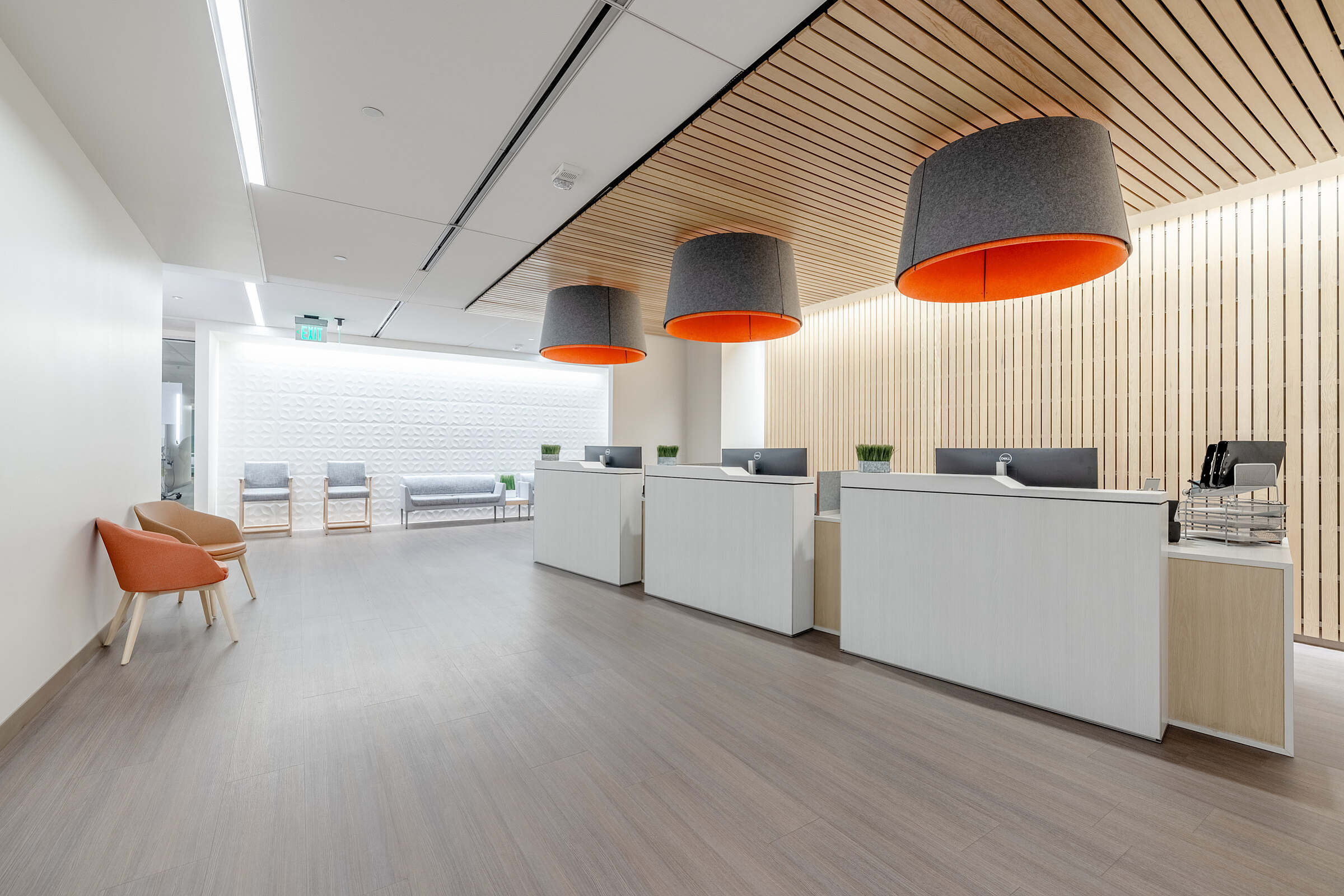 The lobby welcomes visitors with a warm and inviting atmosphere, featuring modern design elements that reflect the building's contemporary character. The wood accent wall behind the reception desk adds a touch of natural elegance, creating a calming and professional first impression.