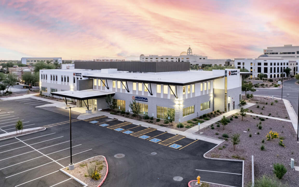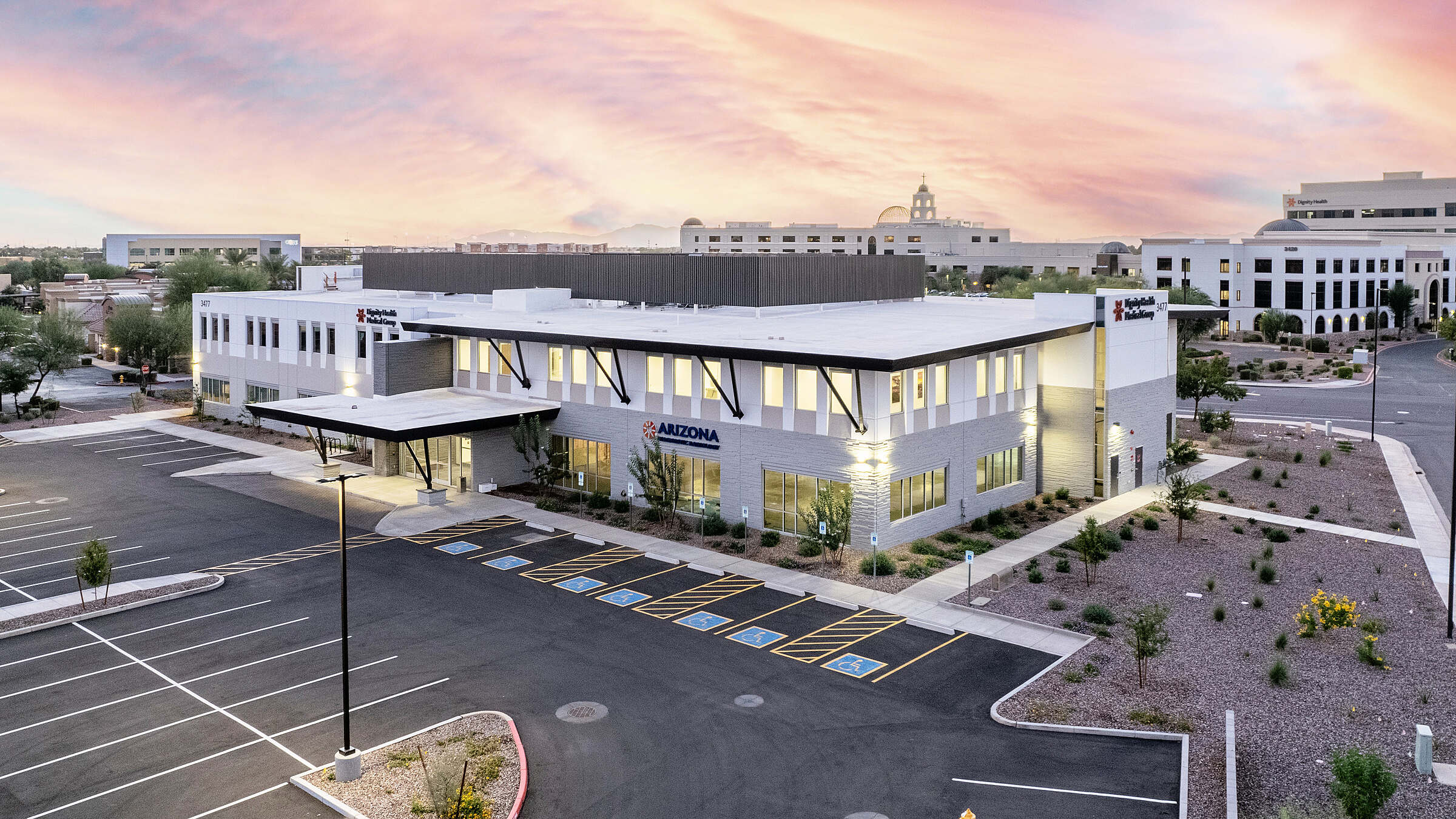 The PMB Mercy Gilbert Medical Center MG3 MOB Core & Shell is a two-story medical office building located on Dignity Health's Mercy Gilbert Medical Center campus. As the third MOB developed by PMB on the campus, this project was envisioned as a teaching clinic to support Dignity Health’s East Valley Graduate Medical Education (GME) program. This initiative aims to train the next generation of physicians while also serving as a recruitment pipeline for skilled, future healthcare providers. To enhance visibility and support intuitive wayfinding, the building was strategically positioned near Mercy Road, with convenient surface and covered parking located at the rear, providing direct access to the main entrance. Its contemporary architectural design establishes a strong presence and reinforces the identity of the campus.