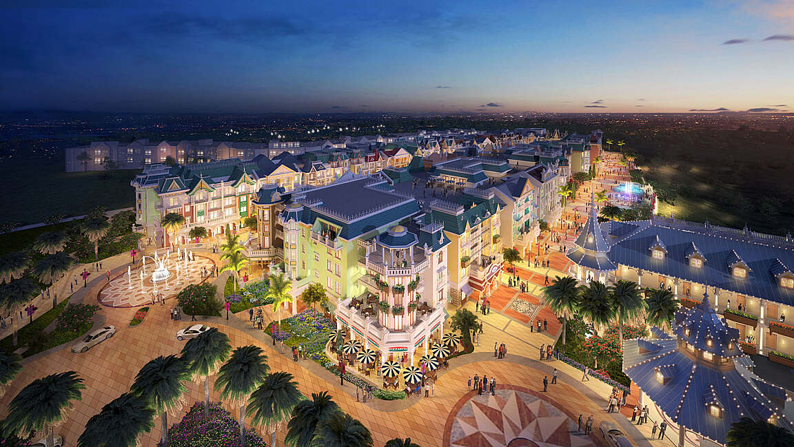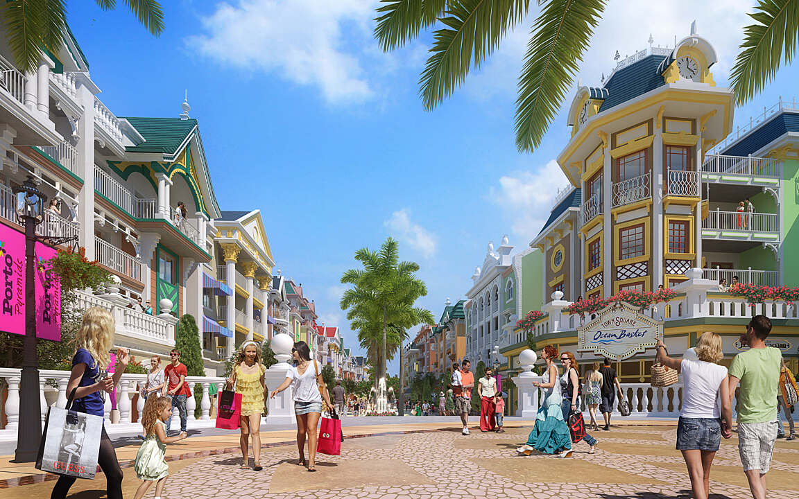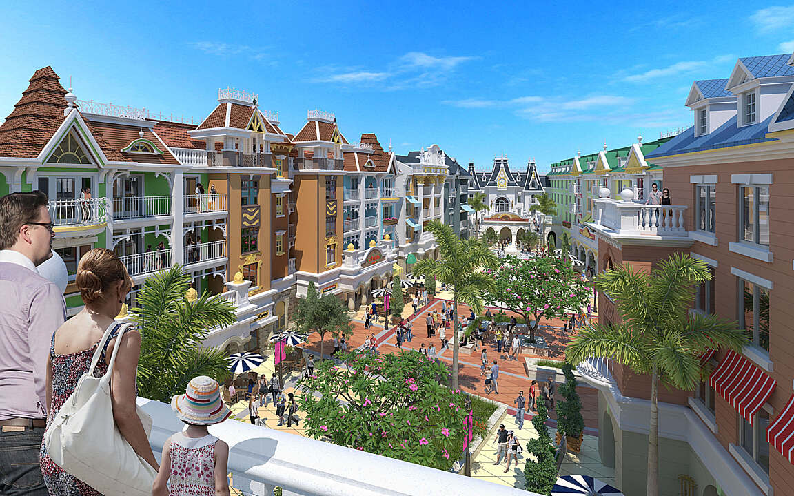 The lively streetscape and promenade are home to high-end shops, fine dining venues, and impromptu street performances. This vibrant setting is enriched with lush landscaping, patterned pavements, water features, and outdoor cafés shaded by colorful awnings and umbrellas. At its heart, a spectacular aqua fountain and light show serves as the project’s central entertainment feature.