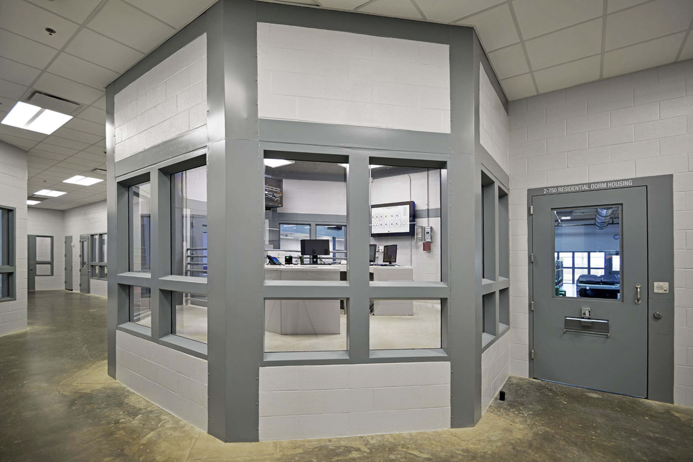 A centralized control room offers clear sightlines down hallways, reducing reliance on security electronics.