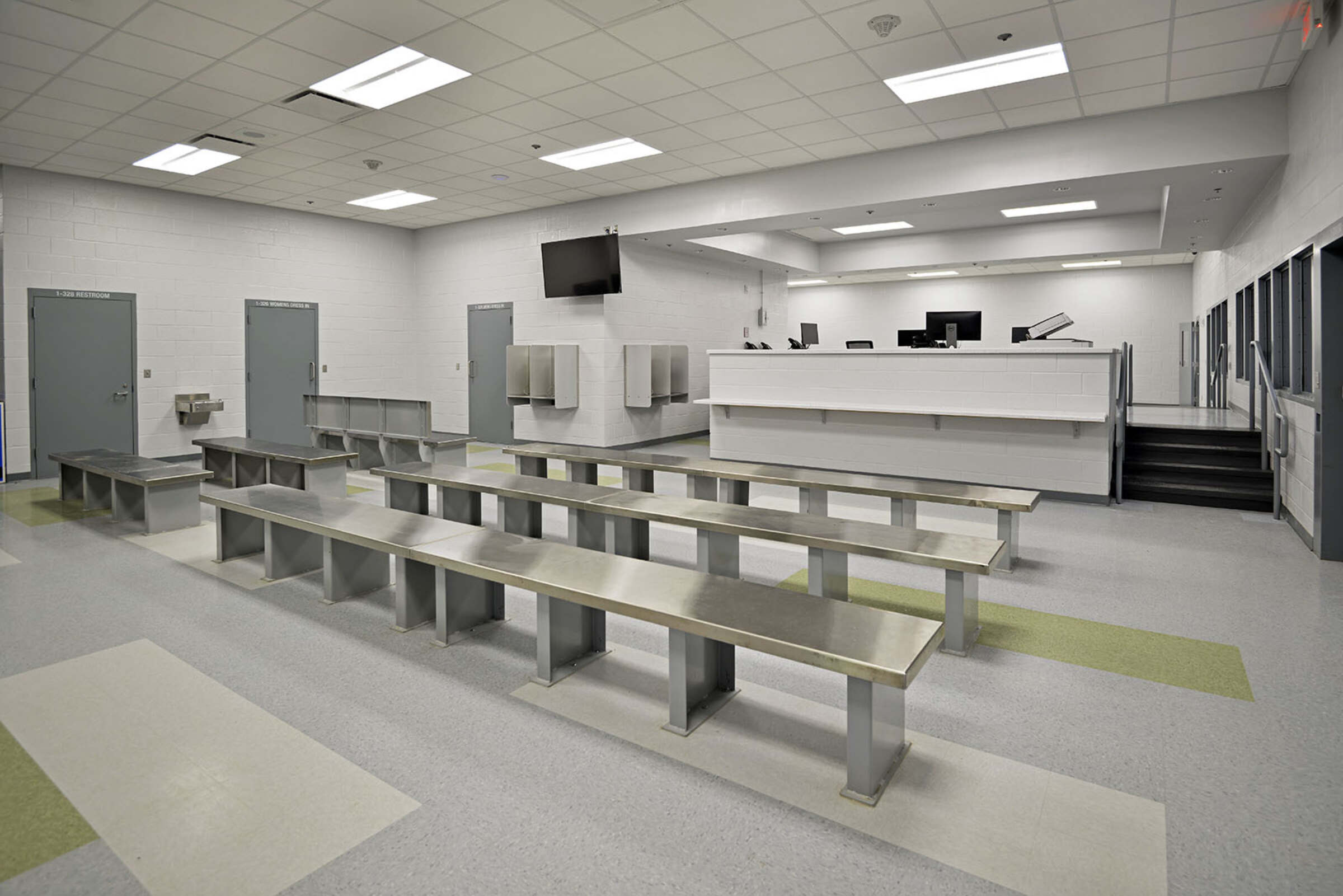 A raised platform within the intake and processing room gives staff added visibility with sufficient separation. The placement of phone banks along the wall also allows for easier monitoring. A secure vehicular sally port is adjacent to the processing area.