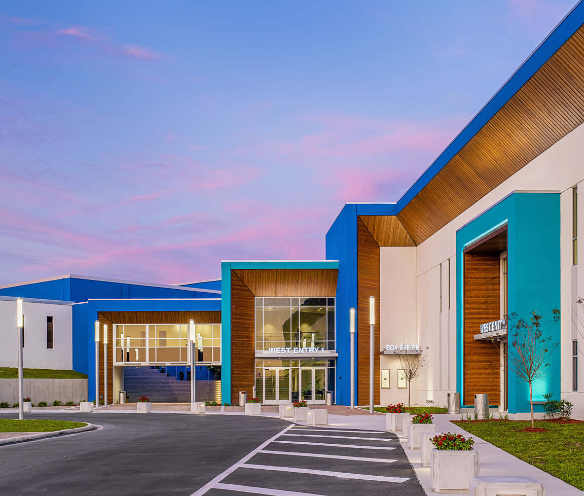 The 690-seat Gymnasium features retractable bleachers and dual cross-court striping to accommodate multiple activities simultaneously. Adjacent pre-function spaces include an outdoor patio, concessions area, and catering kitchen to support game-day events and school functions. In addition to the gym, the Field House includes three practice courts encircled by a four-lane running track with a 200-meter radius.