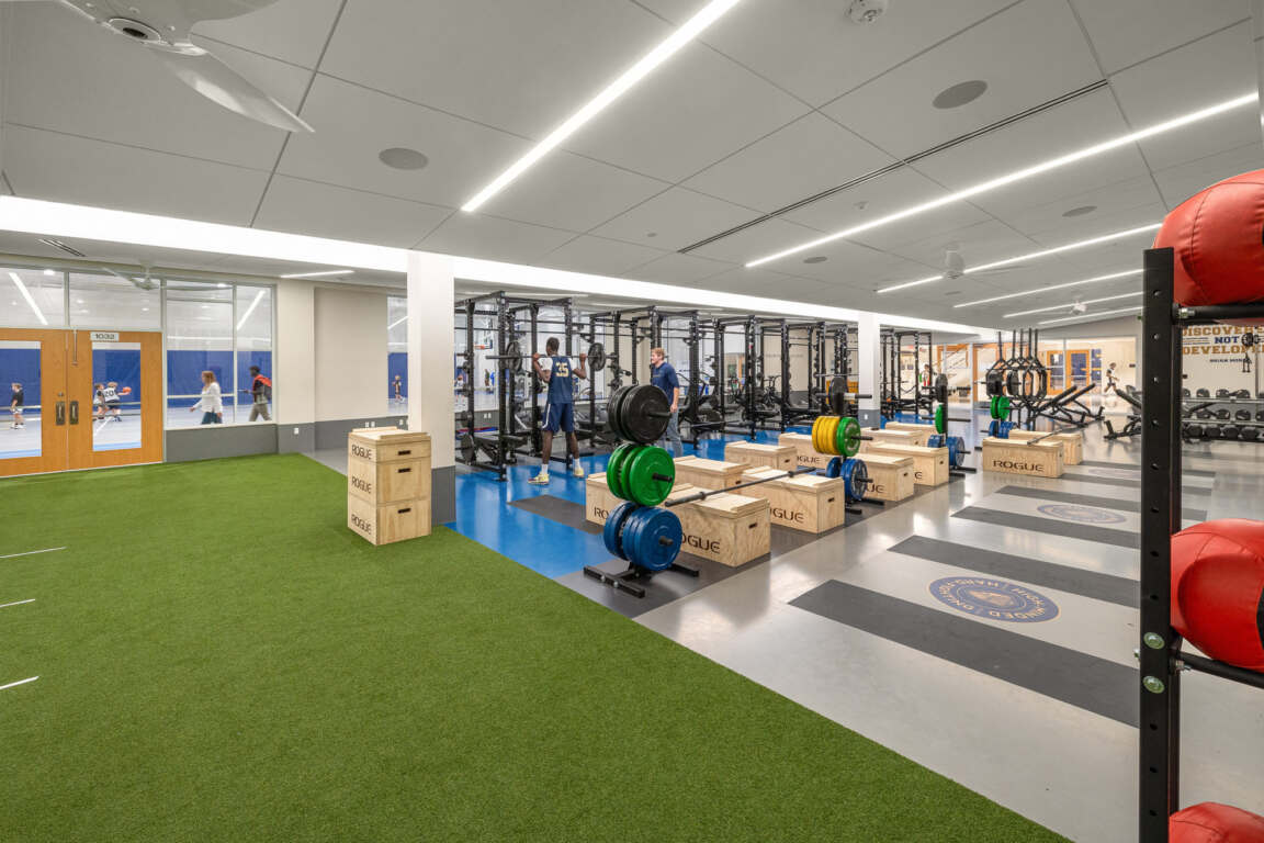 The expansive weight room is equipped with top-of-the-line strength and conditioning equipment, providing a dedicated space for athletes and students to enhance their fitness and performance. With its open layout and natural light, the room fosters a motivating environment for both individual and group workouts.