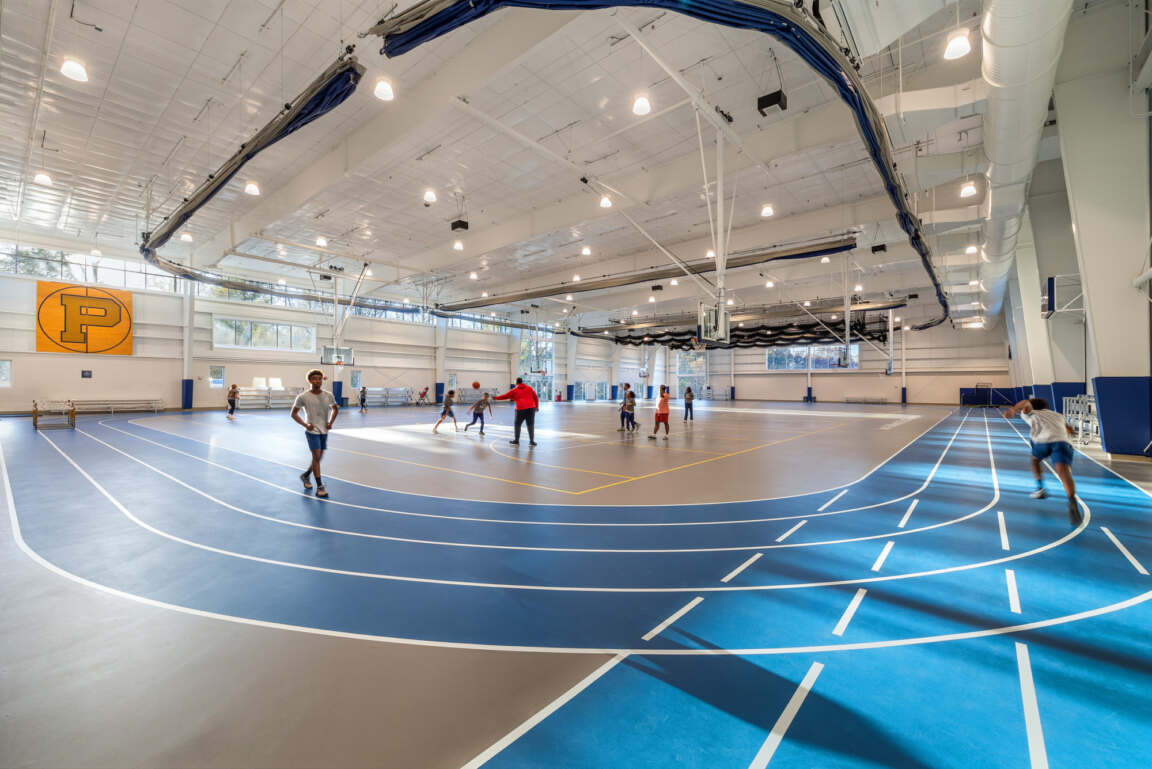 The indoor track encircles three hardwood practice courts and features a 200-meter turn radius, allowing for efficient use of space and simultaneous training activities. Designed for both athletic performance and everyday student use, the four-lane track supports a variety of conditioning and wellness programs year-round.