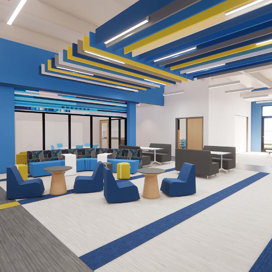 At the core of the design is a contemporary “pod” concept arranged in a spoke-and-wheel layout. Each learning community includes clusters of four or more classrooms that open directly into a shared common area—forming collaborative hubs that strengthen grade-level identity and encourage interaction. Wide overhead doors connect classrooms to these common spaces, allowing learning to extend beyond traditional boundaries. This flexible configuration supports team teaching, project-based learning, and small-group instruction, while dedicated breakout rooms within each pod provide quiet, focused environments for individualized support.