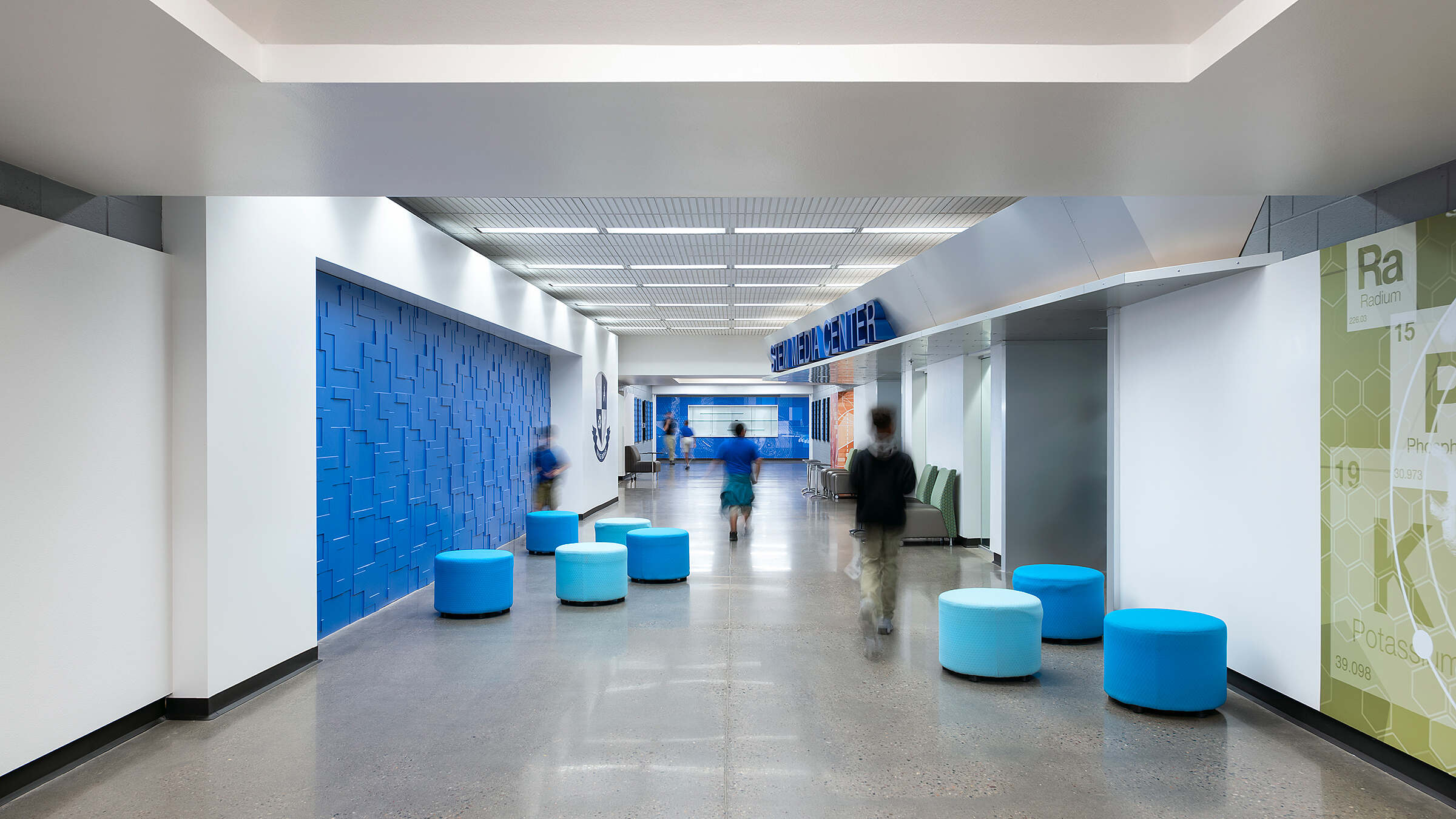 As part of the transformation, the school’s library was converted into a modern, fully digital media center that supports research, collaboration, and multimedia exploration. Surrounding the media center, dedicated breakout spaces were created to serve the academy’s specialized programs, offering flexible zones for project-based learning, small group instruction, and hands-on experimentation. These updates were designed to align with the school’s forward-thinking curriculum and to give students environments that inspire curiosity and critical thinking.