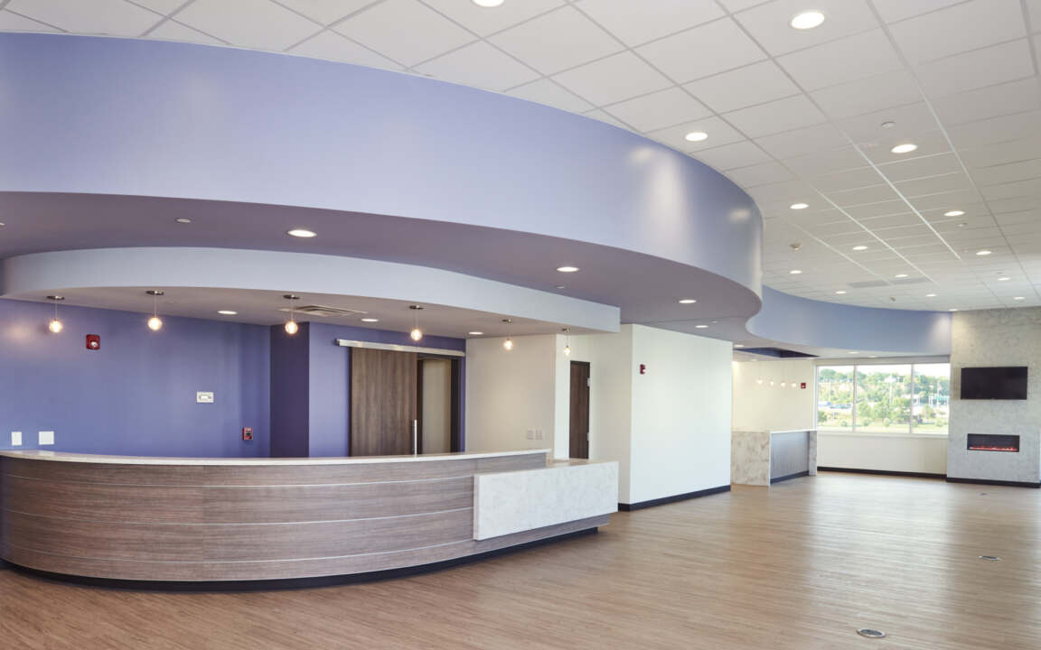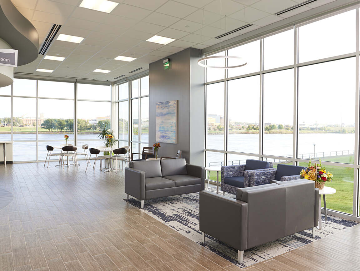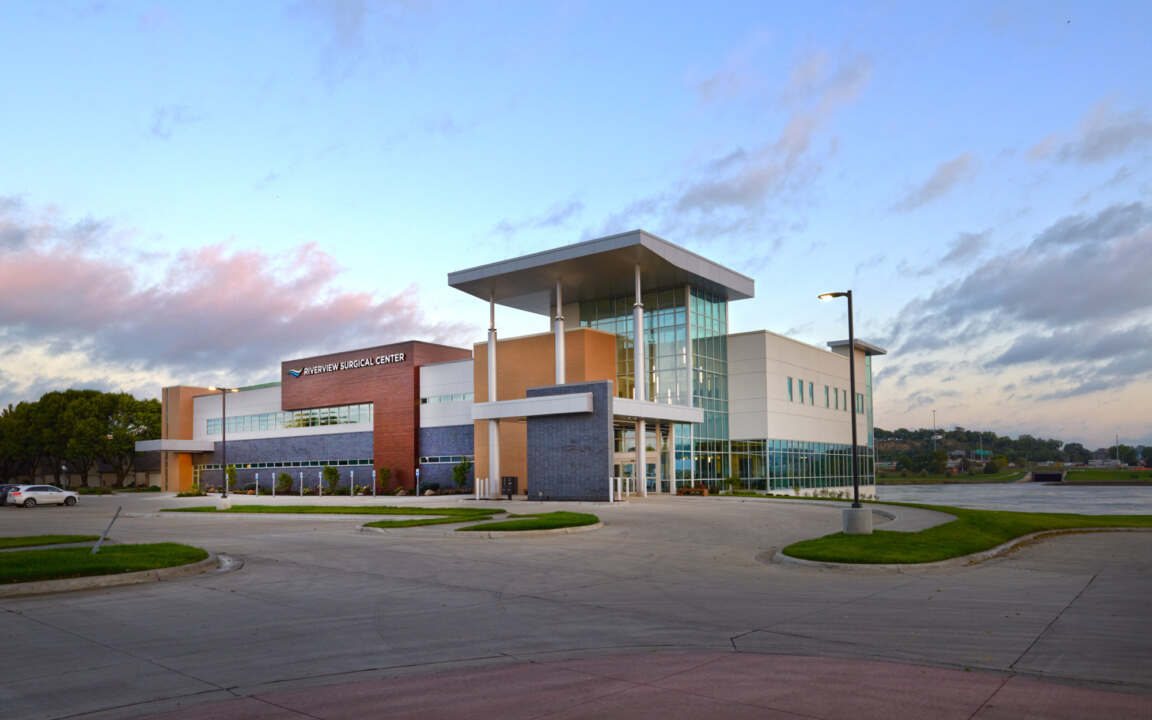 The Riverview Surgery Center is a striking two-story facility located on the bank of the Missouri River in South Sioux City, Nebraska. The project encompasses a 20,790-square-foot Ambulatory Surgical Center, an 8,850-square-foot Medical Office Clinic Suite, and a 6,250-square-foot Plastics Suite, as well as nearly 3,000 square feet of common space. An open exam pod concept allows flexibility and collaboration among various practices.