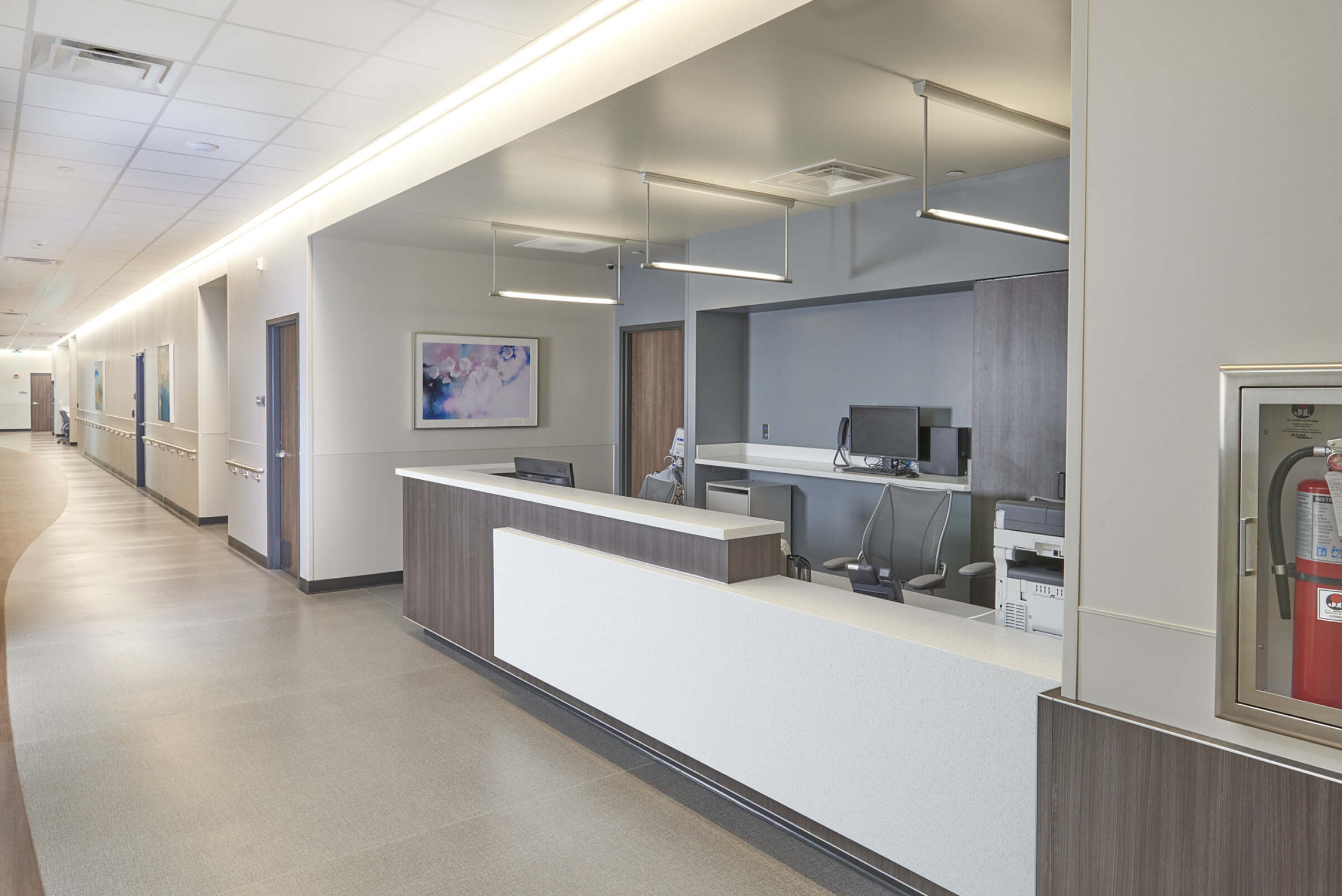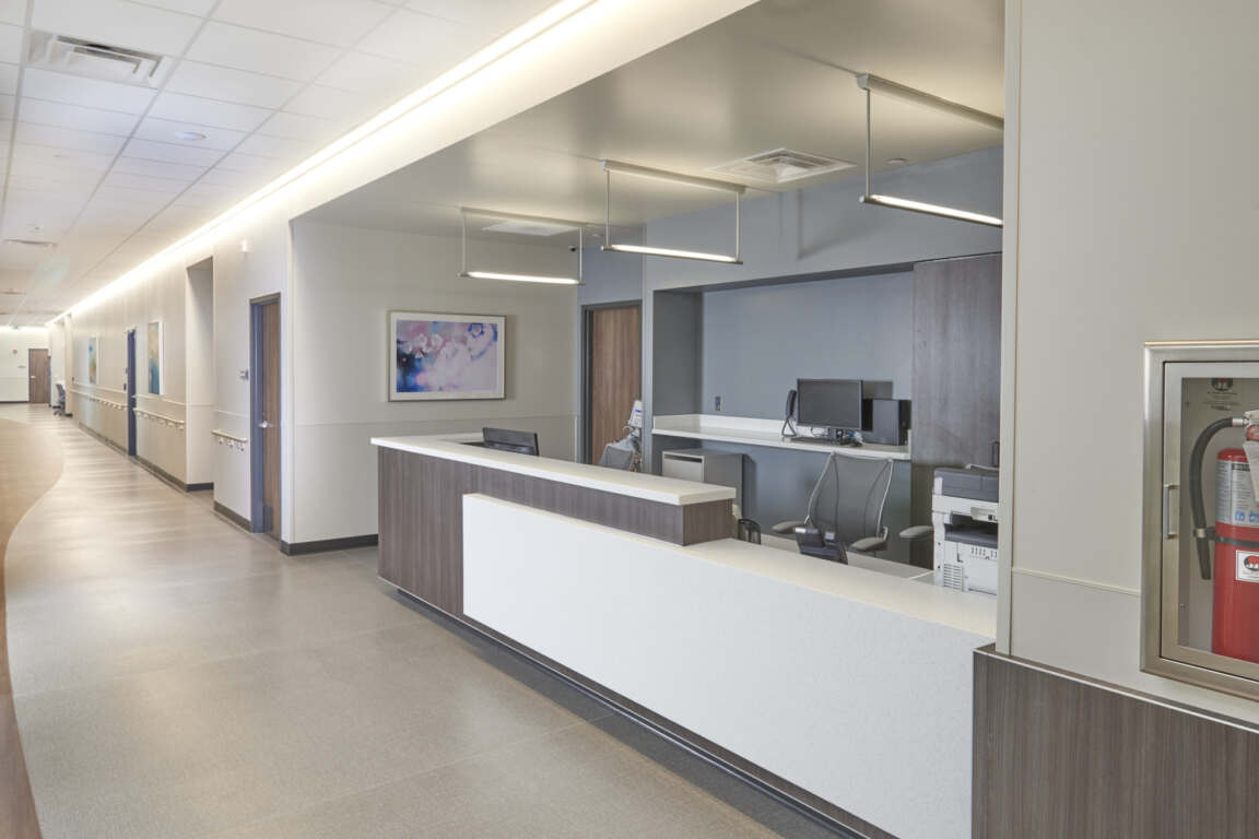 To take full advantage of its waterfront location, the building was designed to maximize views of the river, both from the interior recovery rooms and via two exterior balconies that are available to staff, patients, and visitors. However, the site also required the design team to ensure security through all river conditions by placing the first floor above flood level and engineering a deeper-than-usual foundation.