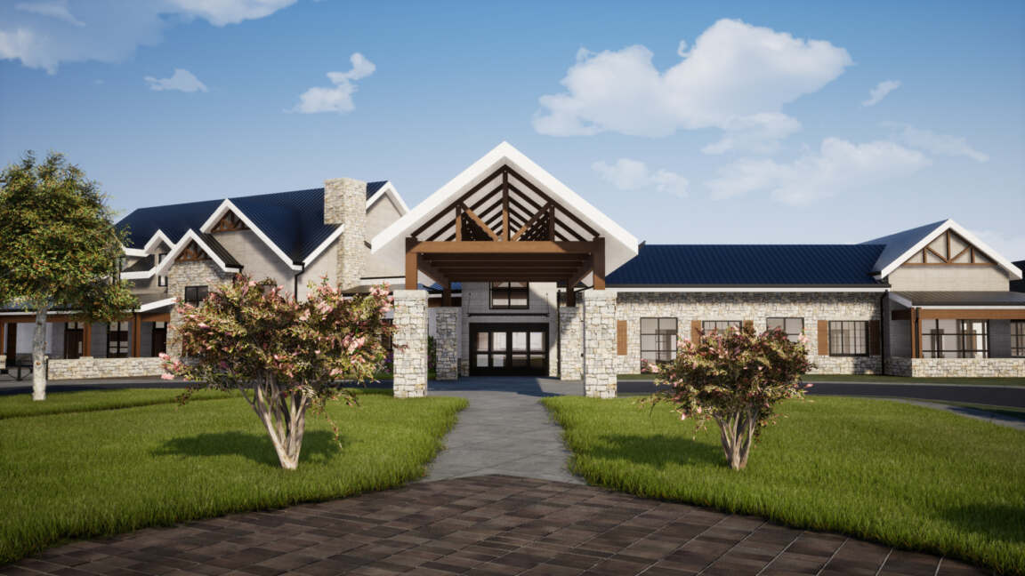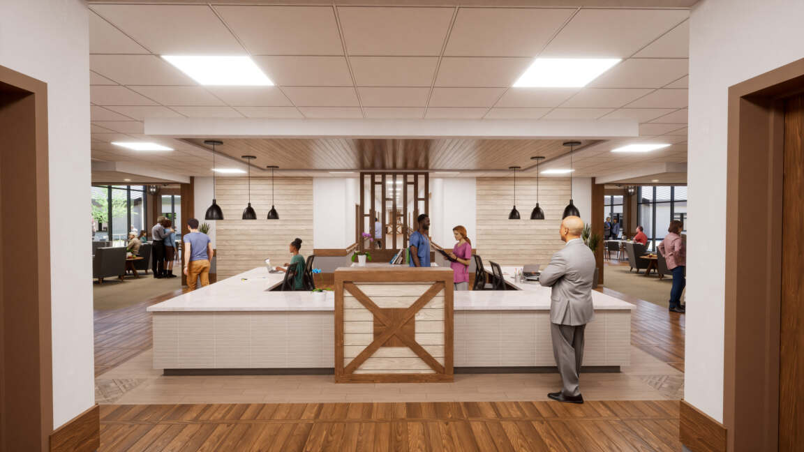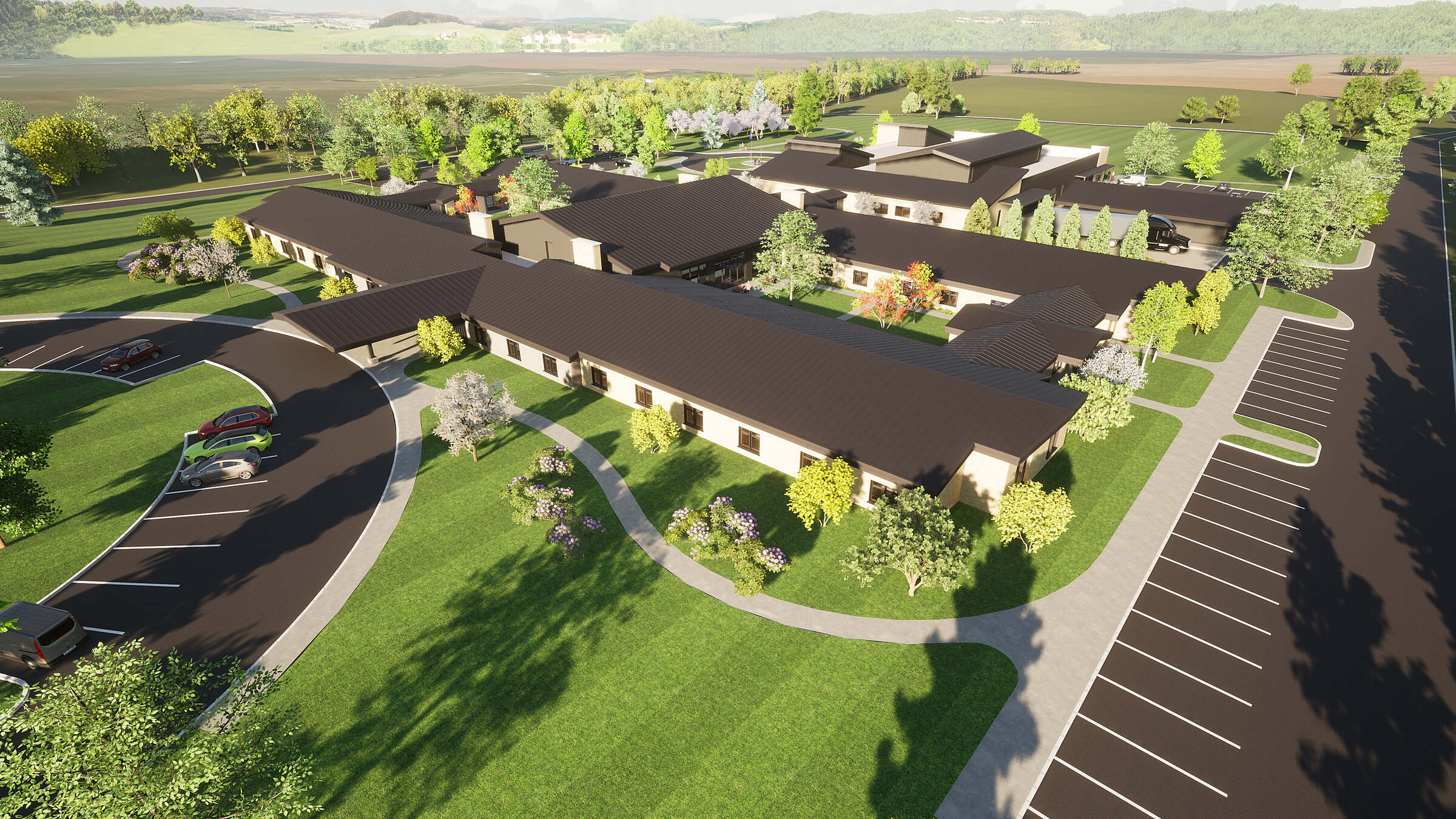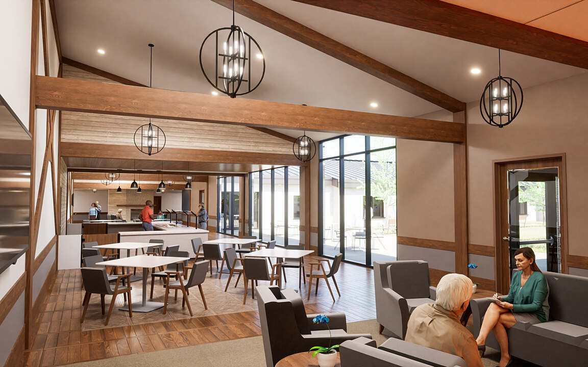 The design also includes a centrally located community center capable of supporting two additional neighborhoods in the future, increasing the total capacity to 120 beds. The community center features amenities such as therapy programs, a multipurpose space, a barber shop, a sports bar/canteen, administrative offices, a central kitchen, laundry facilities, and maintenance/support areas, ensuring comprehensive services for both current and future residents.