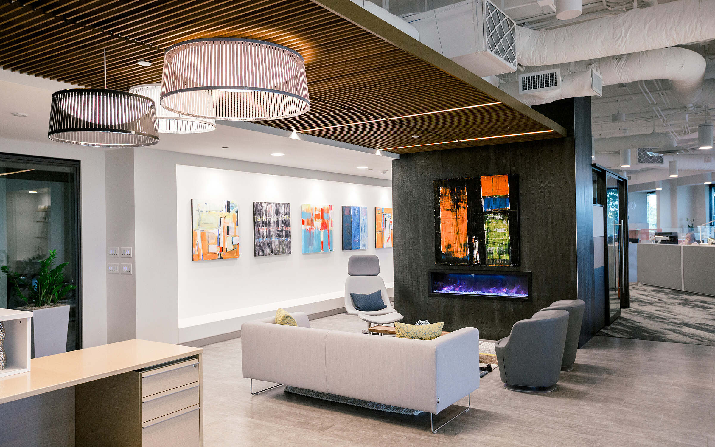 Colorful, dynamic elements mark this space that used “Fort Worth Fresh” as its inspiration. The client moved into this suite following a 15-year stint in its previous location. With the move came a re-branding effort, and natural materials and daylighting were essential to the environment the company desired. Exposed deck and classic finishes designed to endure for up to 15 years were selected to create a light and airy feel, bringing as much natural light as deep into the space as possible.